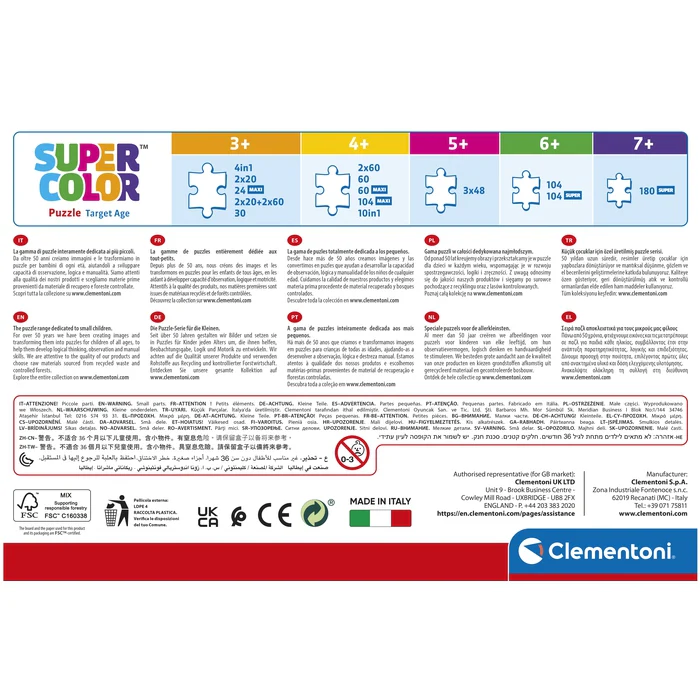 Depuis toujours sensible au problème de l’écologie, Clementoni utilise beaucoup de matériaux recyclés, évitant l’emploi de composants polluants. Made in Italy.