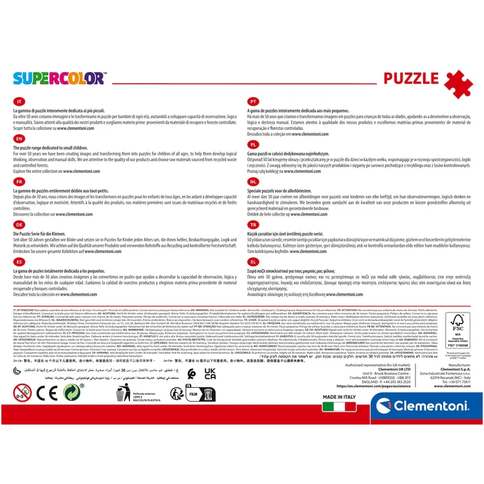 Depuis toujours sensible au problème de l’écologie, Clementoni utilise beaucoup de matériaux recyclés, évitant l’emploi de composants polluants. Made in Italy.