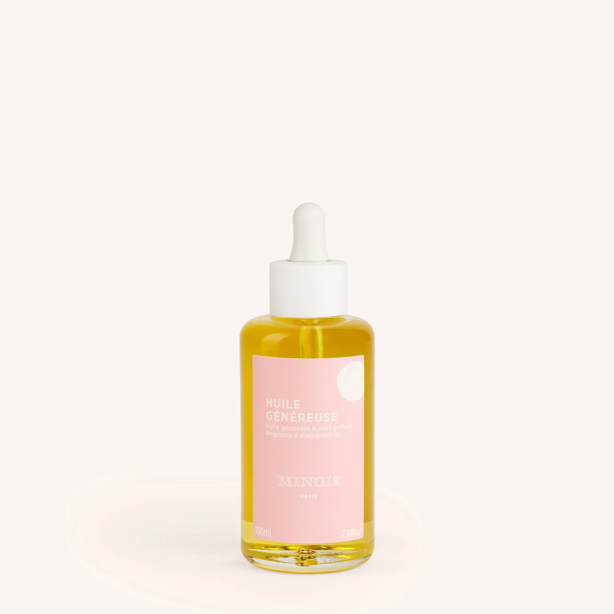 Présentée dans un flacon élégant, l’Huile Généreuse est idéale pour chouchouter votre peau ou offrir un moment de douceur à une future ou jeune maman.
