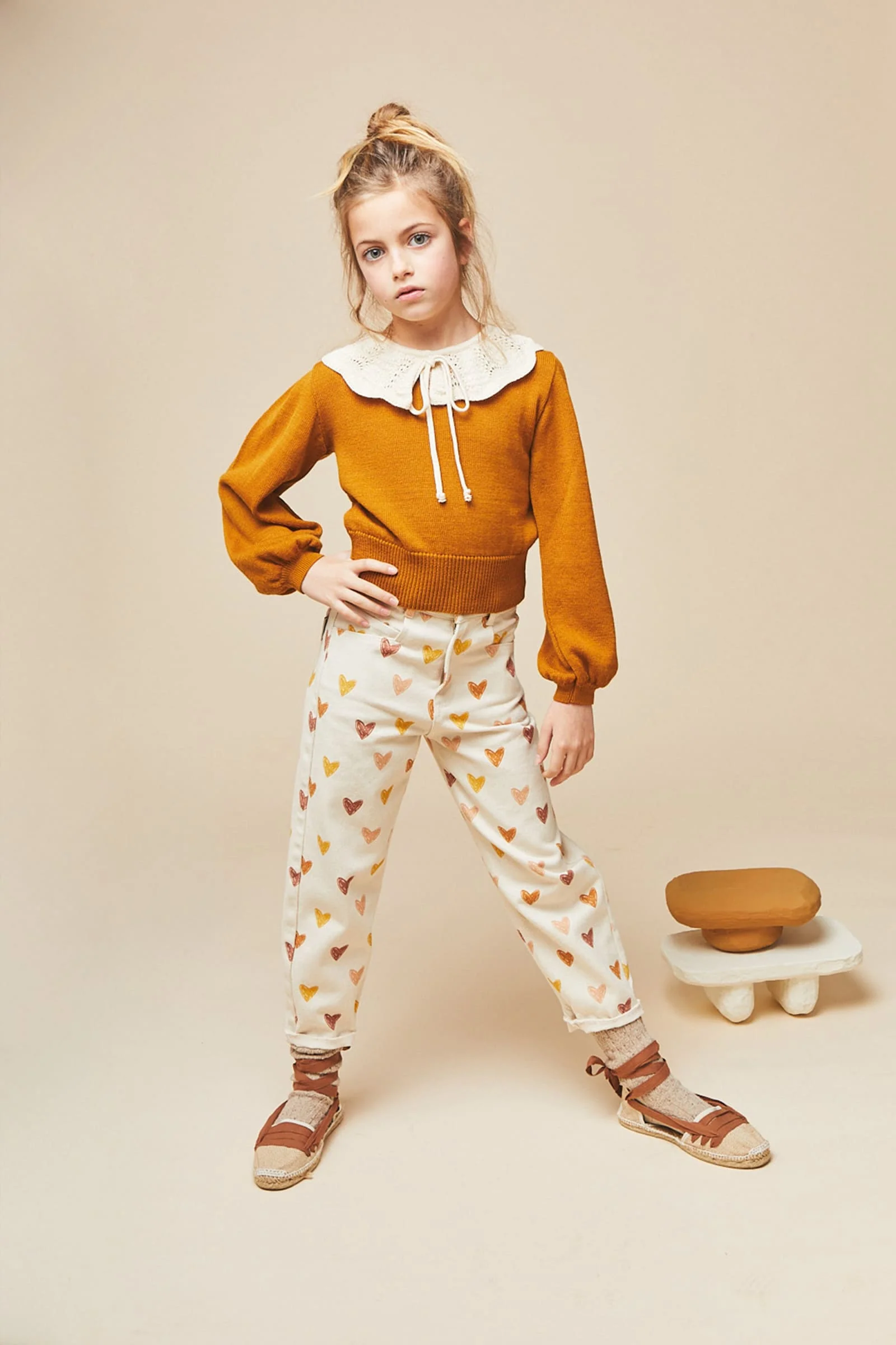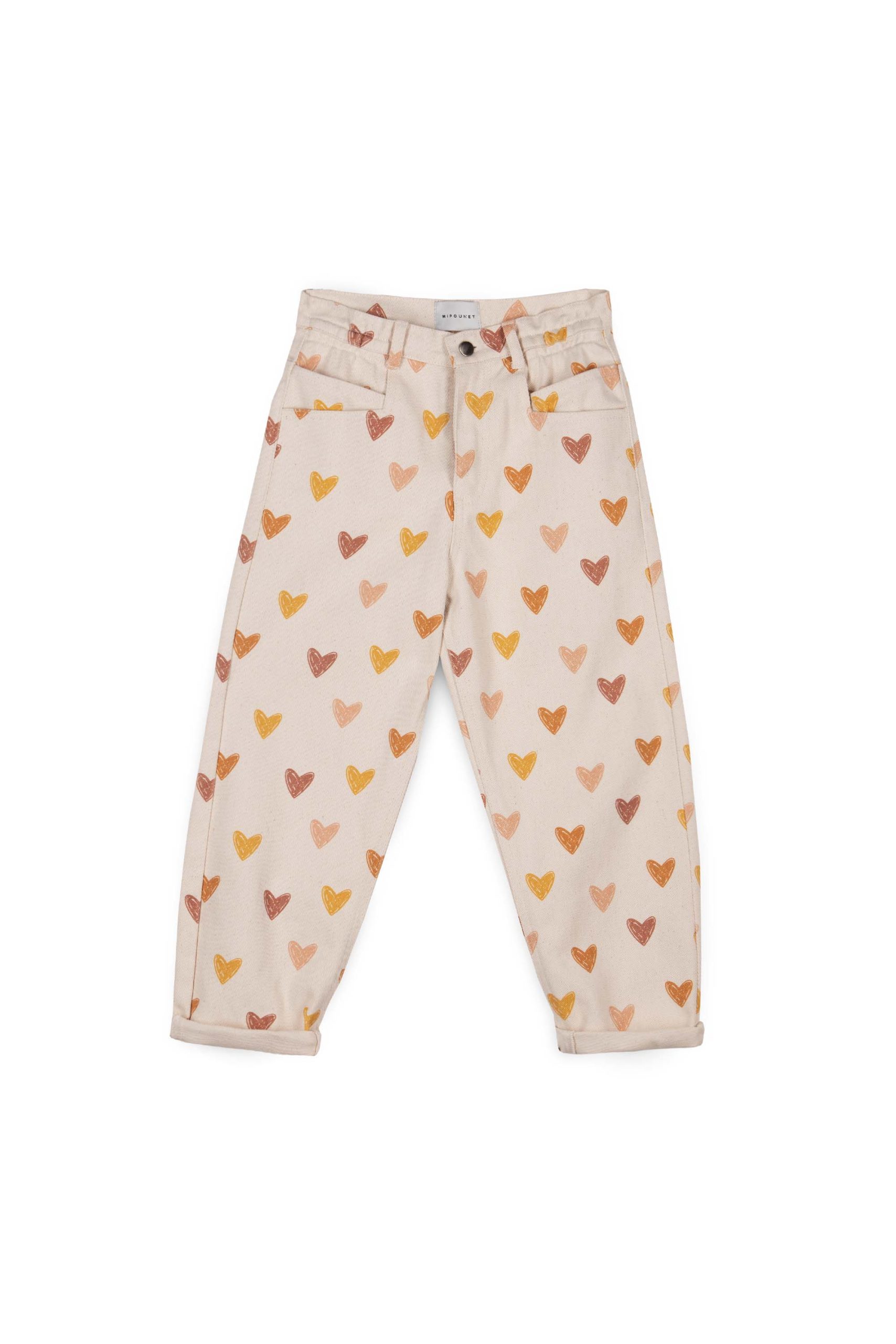 Le jean Love : les enfants vont l’adorer ! En effet comment ne pas tomber amoureux de ce motif aux cœurs crayonnés sur fond crème ? Il a une touche moderne, tellement dans l’air du temps avec sa coupe mom fit hyper confortable. Jean à cinq poches.
