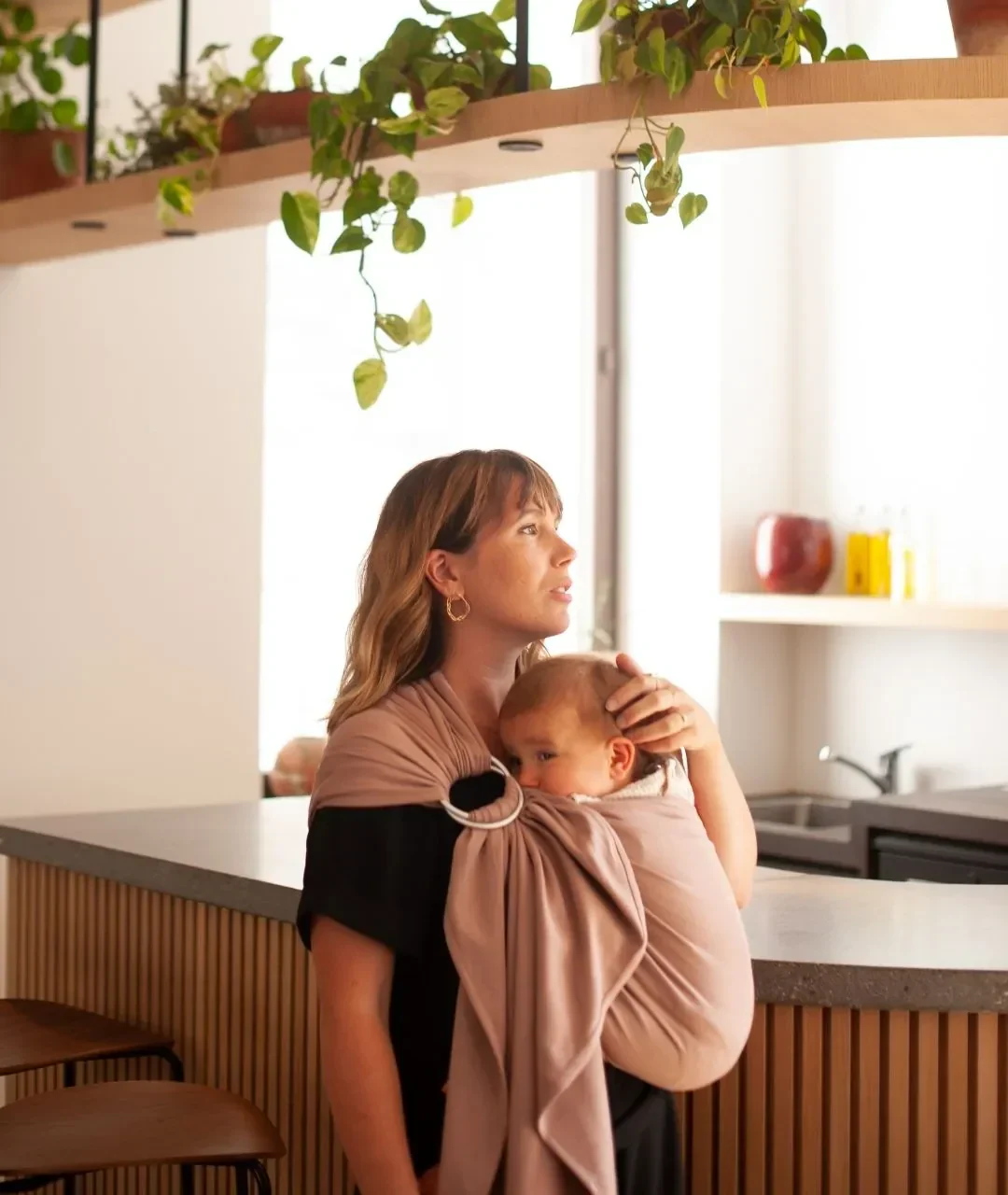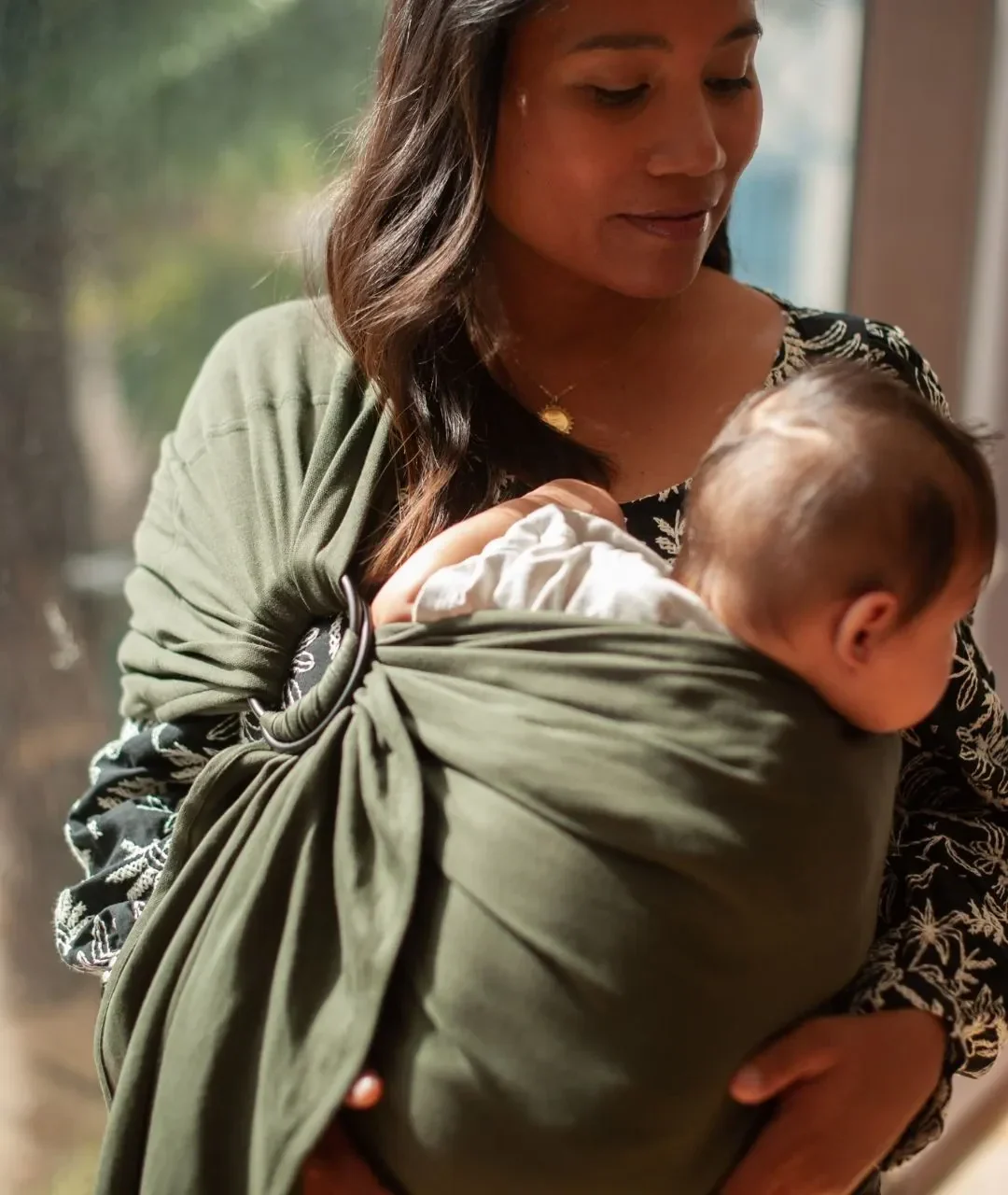 Notre Sling Mama Hangs est conçu pour porter votre bébé dès la naissance jusqu’à 10 kg. Grâce à ses deux anneaux, le réglage est simple et rapide, vous permettant de porter votre enfant soit face à vous, soit sur votre hanche. Une fois bébé confortablement installé, le sling se range facilement dans sa poche intégrée, le rendant compact et facile à transporter.