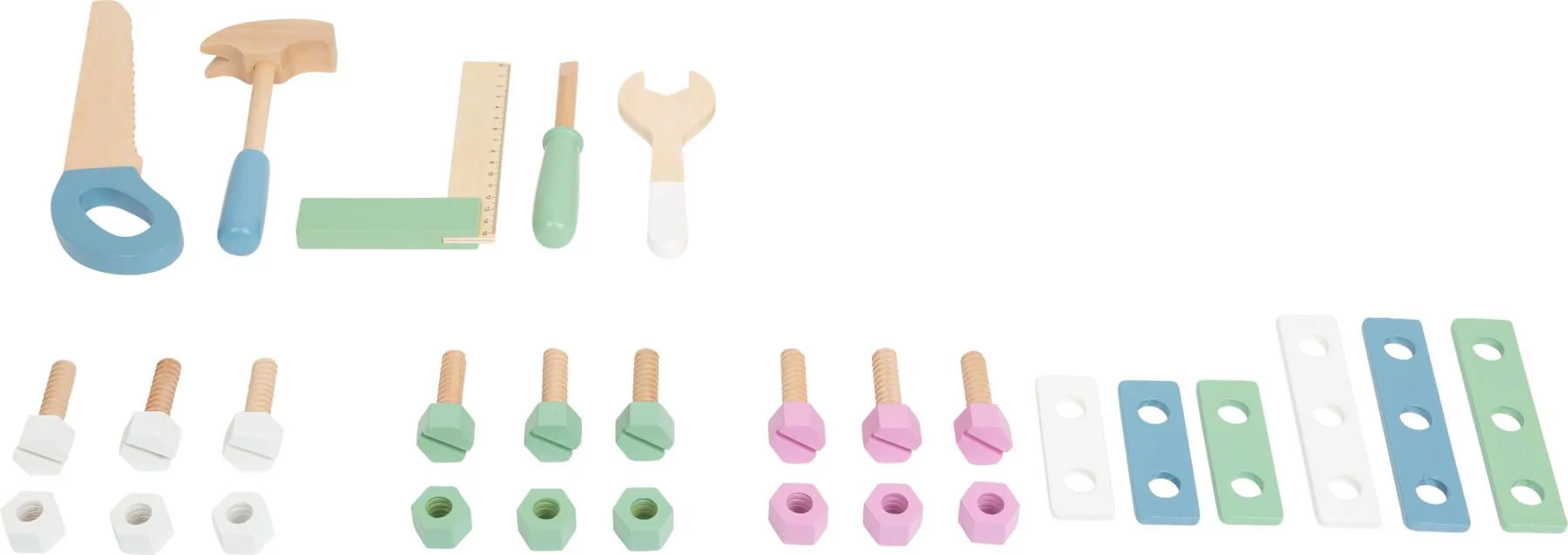 Des couleurs douces, des formes présices, des matériaux naturels, voilà le design nordique! Avec ce robuste établi en bois, garçons et filles apprennent leurs premières activités de bricolage de manière ludique. Les 5 outils différents et les 24 accessoires forment également la motricité fine.