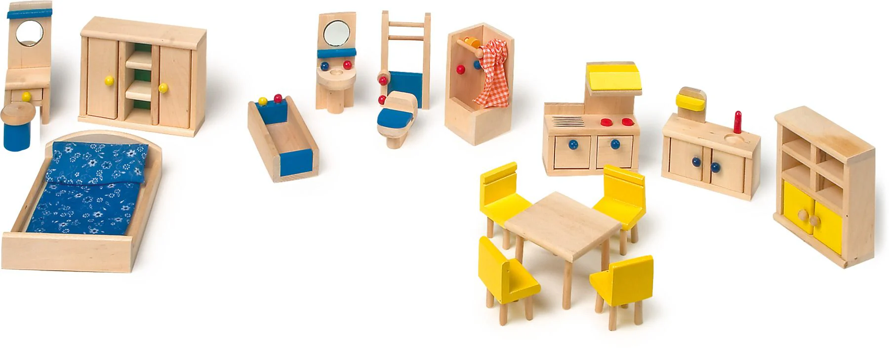 18 meubles en bois pour maison de poupées y compris la cuisine! Des heures de jeu en perspective…