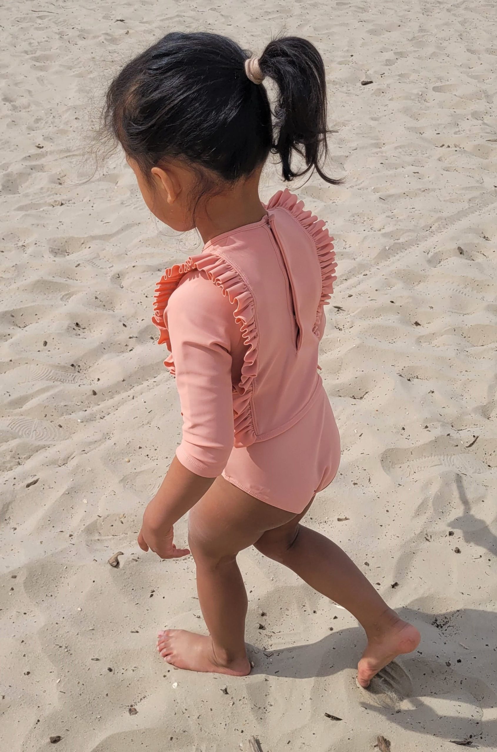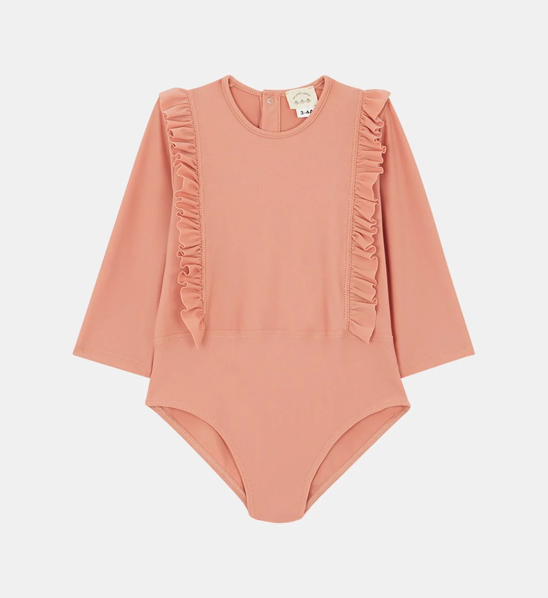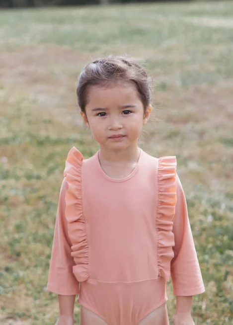Élégant maillot body anti UV rose corail à volants et manches trois quart. Une belle coupe épurée et féminine pour vos filles !