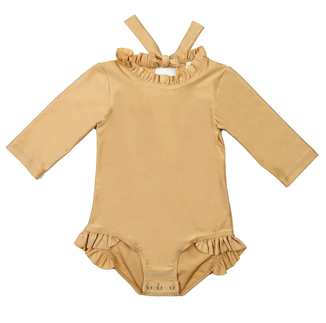 Peut-on faire plus élégant que ce sublime maillot Castille doré avec son col Versailles, son nœud dans le dos du cou et ses petits volants ? Votre trésor sera tel un beau rayon de soleil dans son maillot de lumière ! Nous sommes amoureux de sa couleur qui se mariera parfaitement avec les peaux dorées de vos princesses en été.