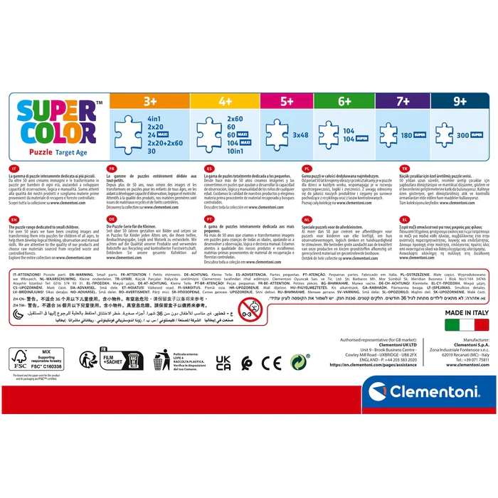 Depuis toujours sensible au problème de l’écologie, Clementoni utilise beaucoup de matériaux recyclés, évitant l’emploi de composants polluants. Made in Italy.