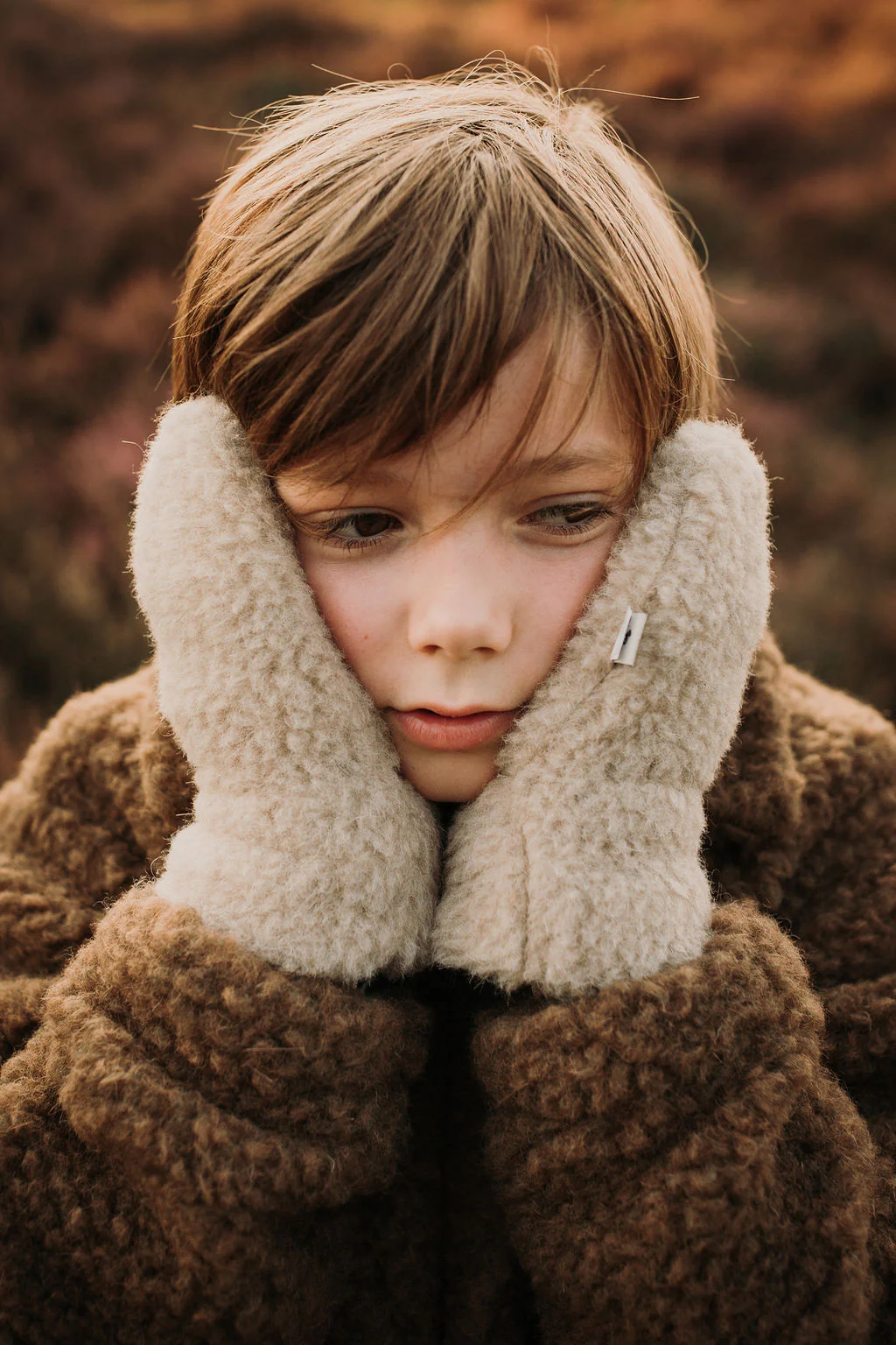 Moufles en laine pour enfant couleur beige faciles à enfiler. Les mains de vos enfants seront bien au chaud dans ces moufles en laine à l’aspect doudou polaire.