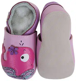 Sur ces chaussons bébé en cuir souple, la petite baleine est en course et défie les plus sportives d’entre vous !