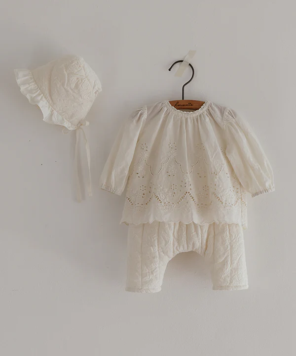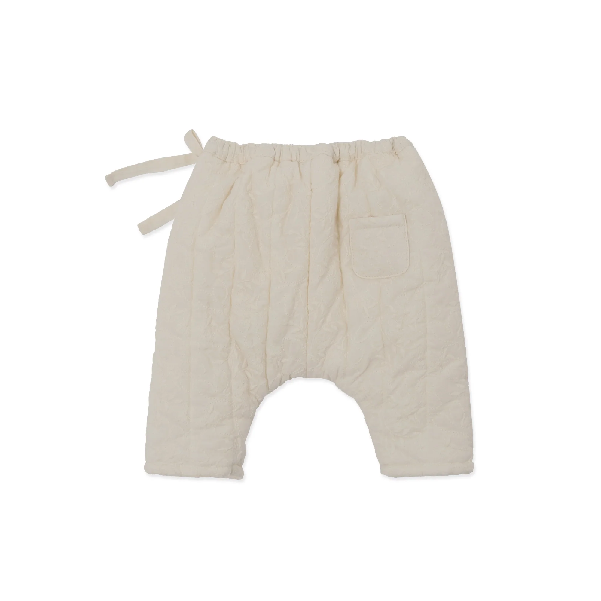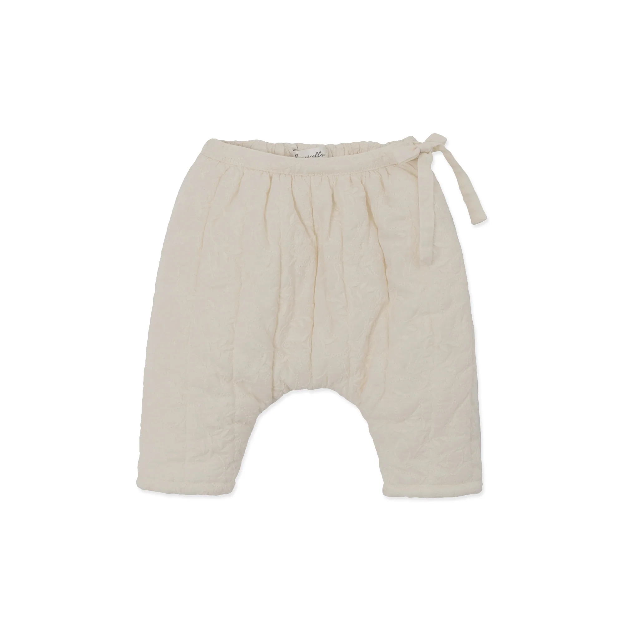 Pantalon matelassé écru avec taille resserrable via un cordon sur le côté au niveau de la taille. Le détail discret et subtile qui fait toute la différence : ses fines broderies de feuilles en écru sur toute sa surface.