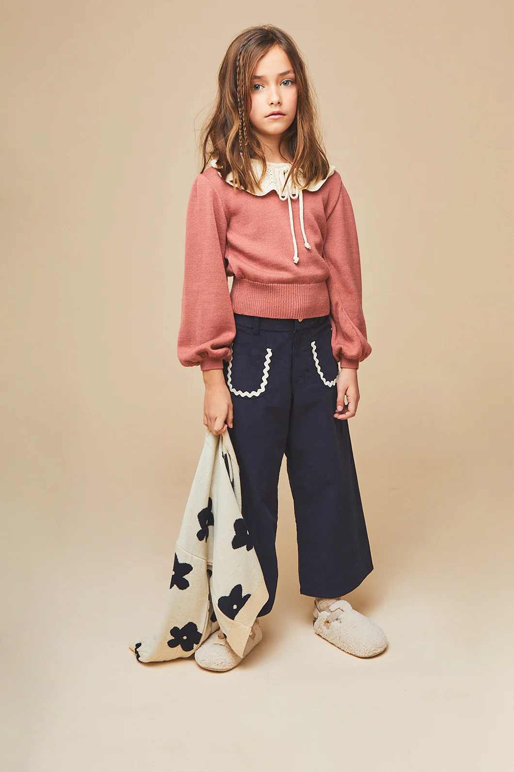 Bianca, le pantalon en velours au tomber parfait : ajusté à la taille et large au niveau des jambes. Le petit détail qui fait la différence : ses poches plaquées bordées de ruban ondulé crème pour un contraste juste adorable avec le bleu nuit du pantalon. Et que dire de la douceur de son velours en coton côtelé bitume ! Un pantalon donc très agréable à porter avec sa coupe wide et qui va avec tout : que ce soit avec la blouse Tartan Bella ou encore nos pulls Gala.