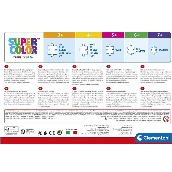 Depuis toujours sensible au problème de l’écologie, Clementoni utilise beaucoup de matériaux recyclés, évitant l’emploi de composants polluants. Made in Italy.