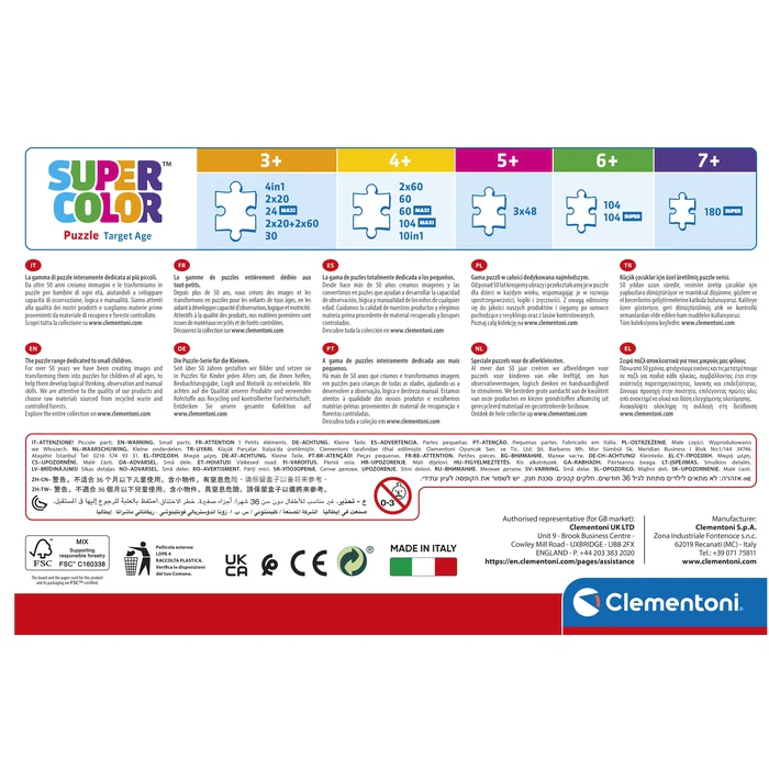 Depuis toujours sensible au problème de l’écologie, Clementoni utilise beaucoup de matériaux recyclés, évitant l’emploi de composants polluants. Made in Italy.