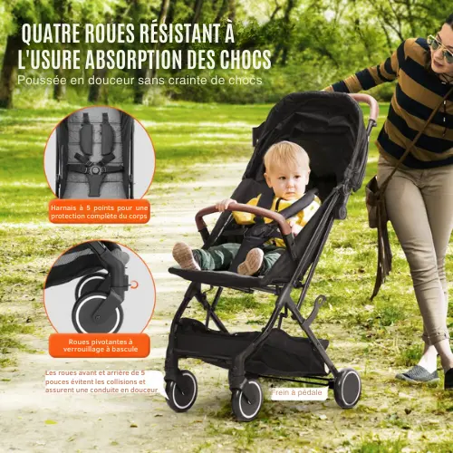- Promenade en douceur: conception de suspension de roue avant et arrière solide en EVA de 5 pouces, avec roues pivotantes à verrouillage à bascule et frein à pédale, empêchant efficacement le glissement, équipée d’une suspension à ressort intégrée et d’un harnais de sécurité à 5 points, offrant une expérience de poussée en douceur, faire face facilement aux routes cahoteuses.