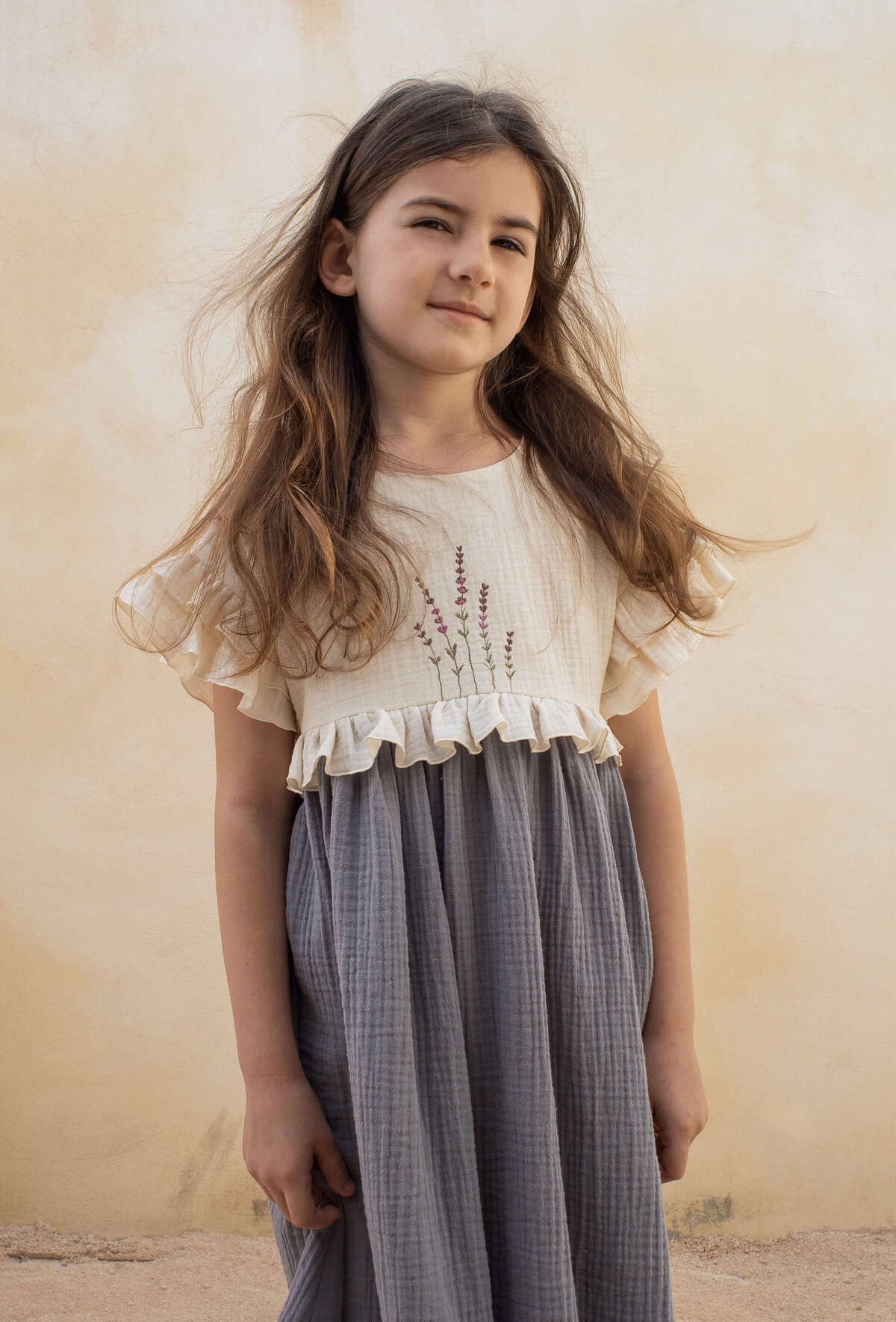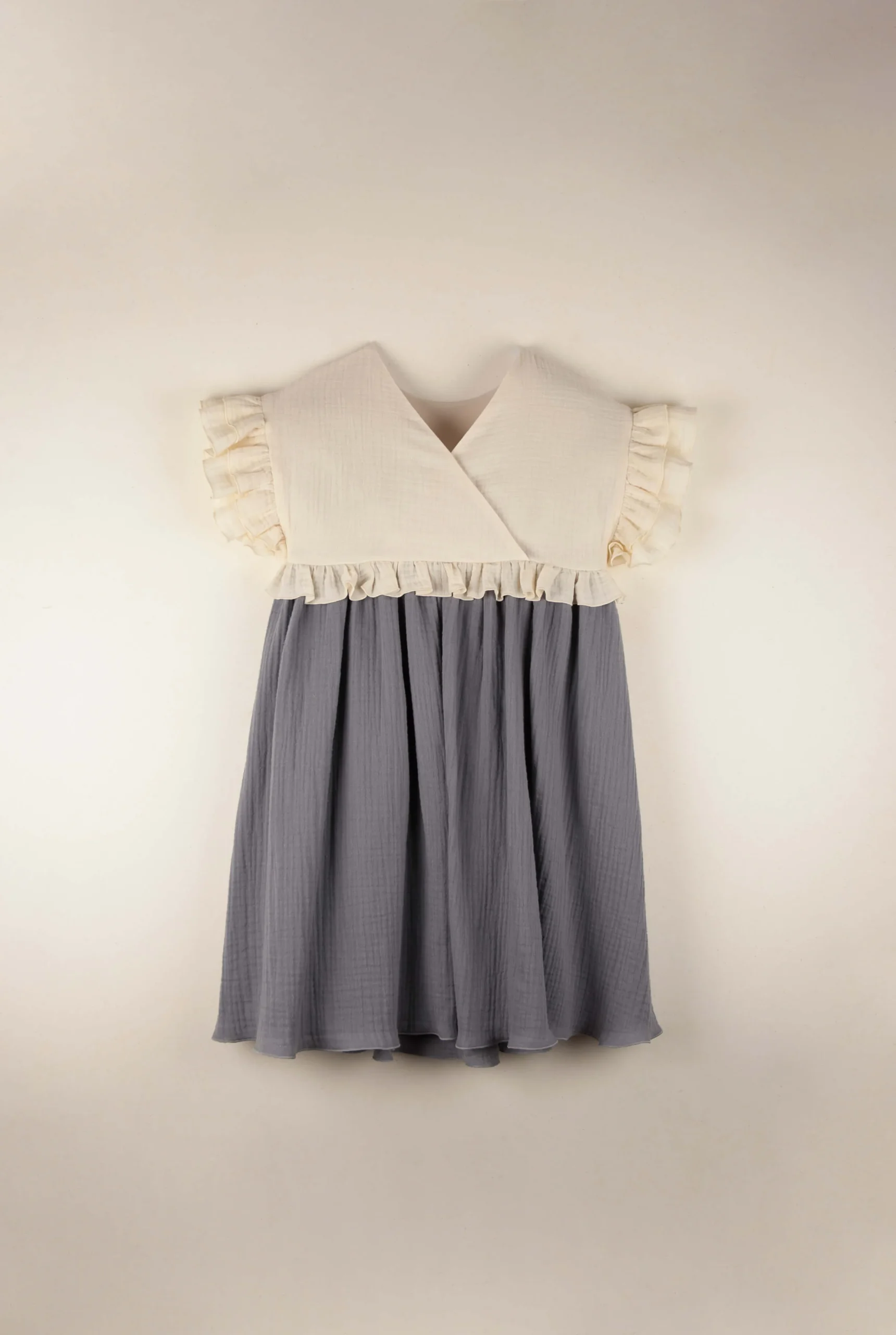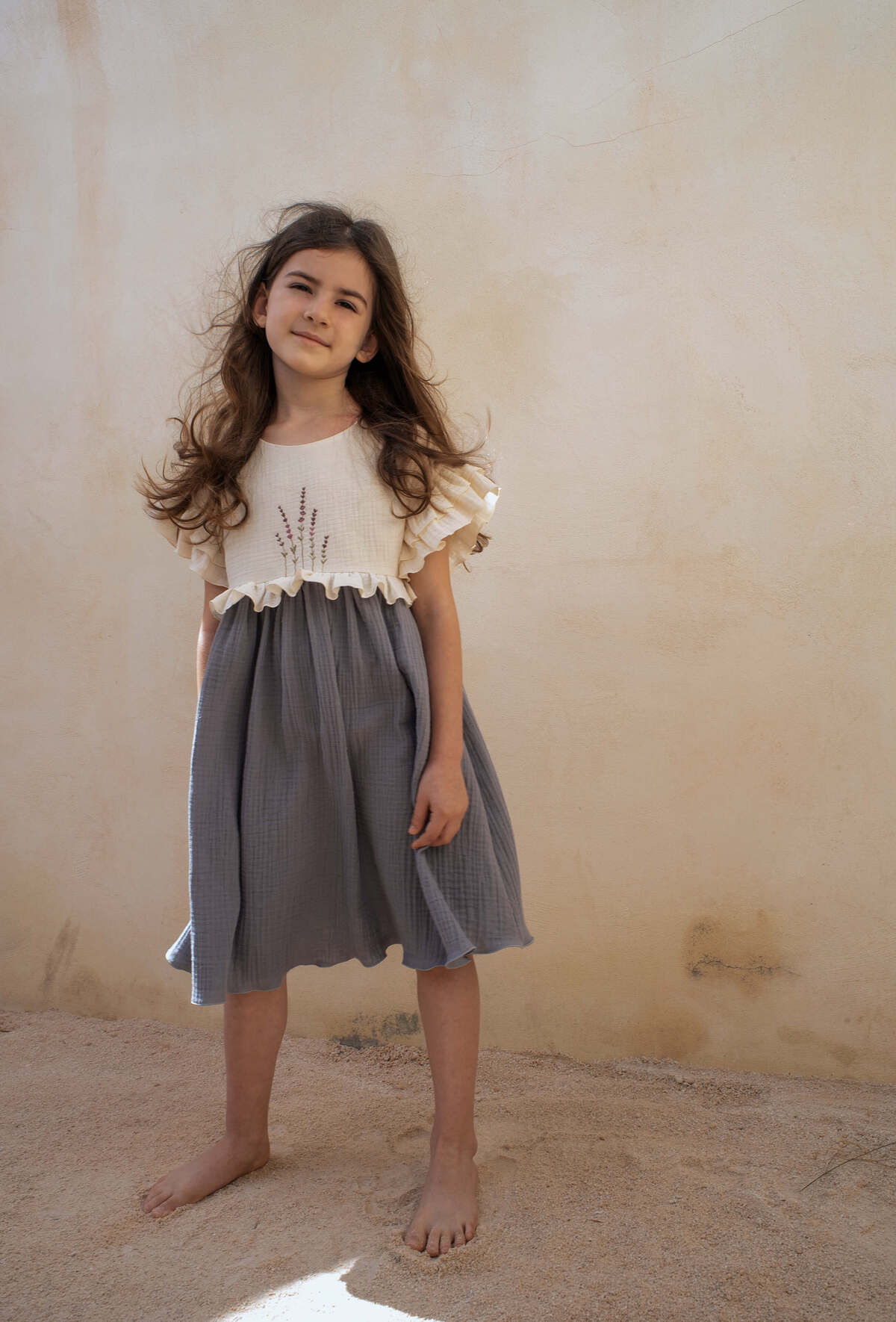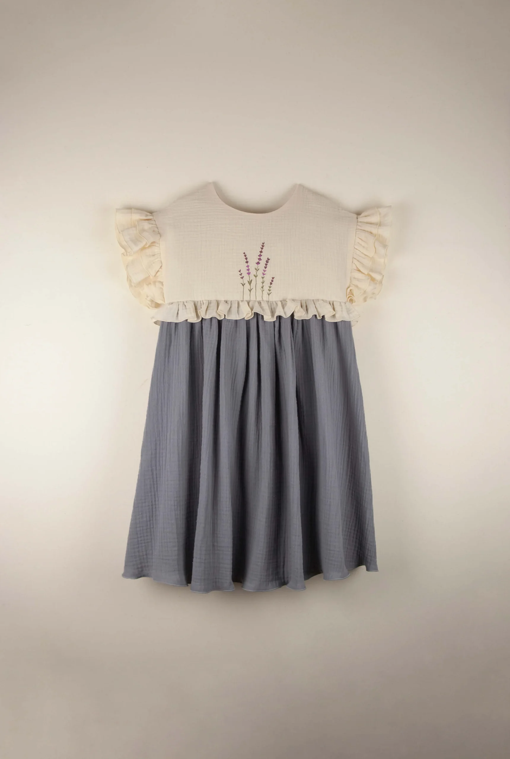 Cette robe en double gaze de coton biologique sera un plaisir à porter ! Agréable avec sa coupe ample, la robe Adelaïde est épurée et en même temps coquette avec sa broderie exclusive de lavande et ses volants au niveau des manches et de la taille. Joli dos croisé en V.