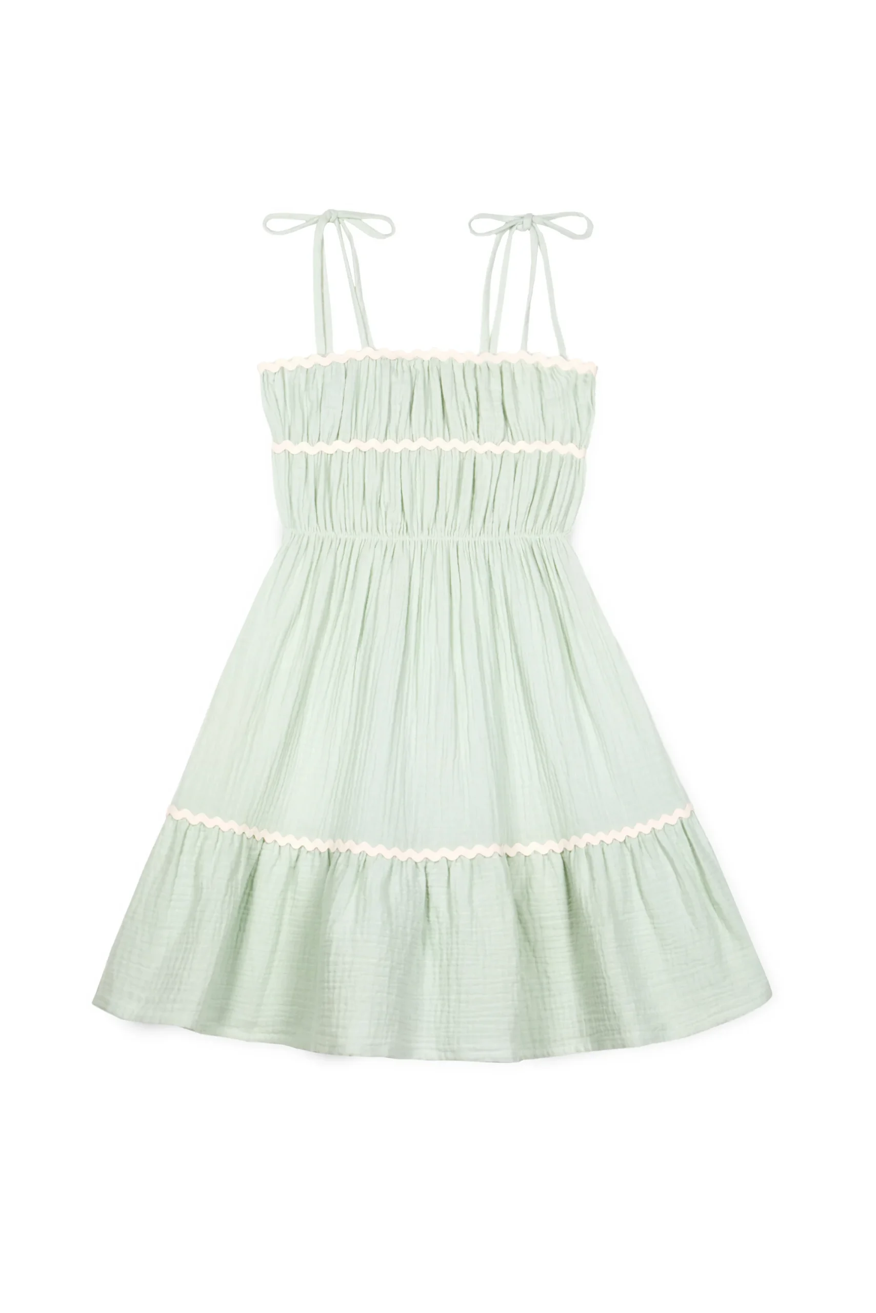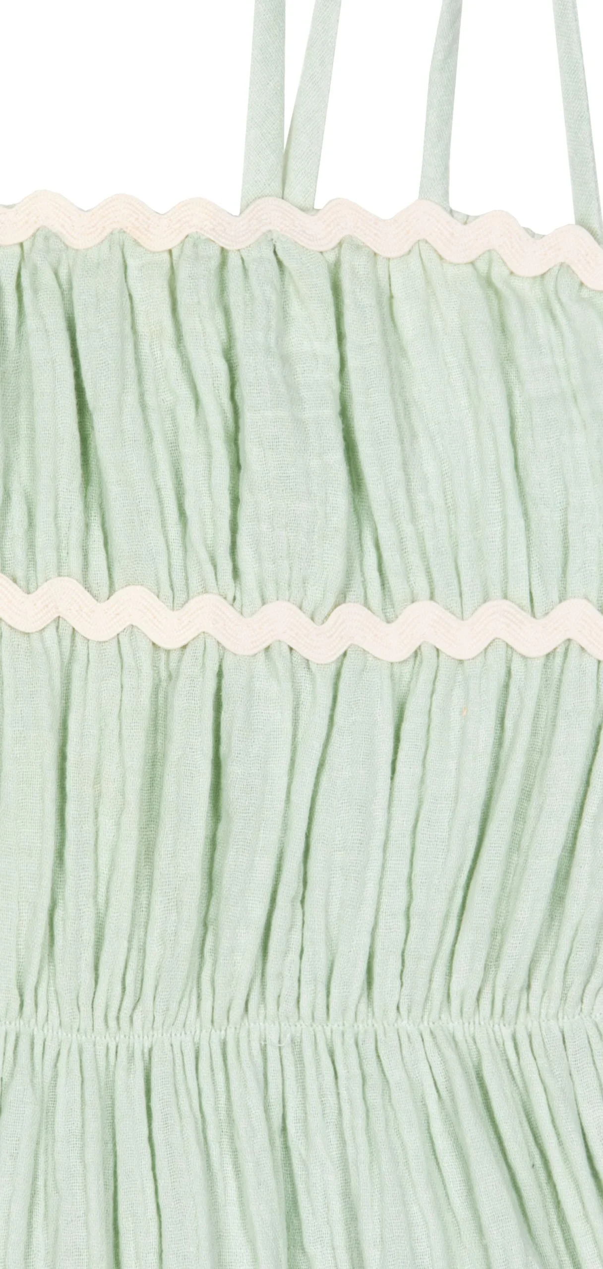 Tel un écrin de fraîcheur, la robe Anette est faite pour habiller votre enfant lors des chaudes journées d’été. Conçue dans une mousseline de coton bio texturée, légère et respirante, sa délicate couleur vert d’eau vous charmera par sa douceur. Une vraie robe de soleil dont les détails – coupe évasée, fines bretelles à nouer au niveau des épaules, fronces au niveau du corsage, jolies bandes de ruban ondulées contrastantes – apportent encore plus d’élégance ! Robe sans doublure mais complètement opaque.