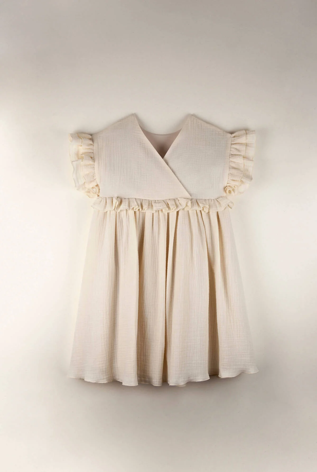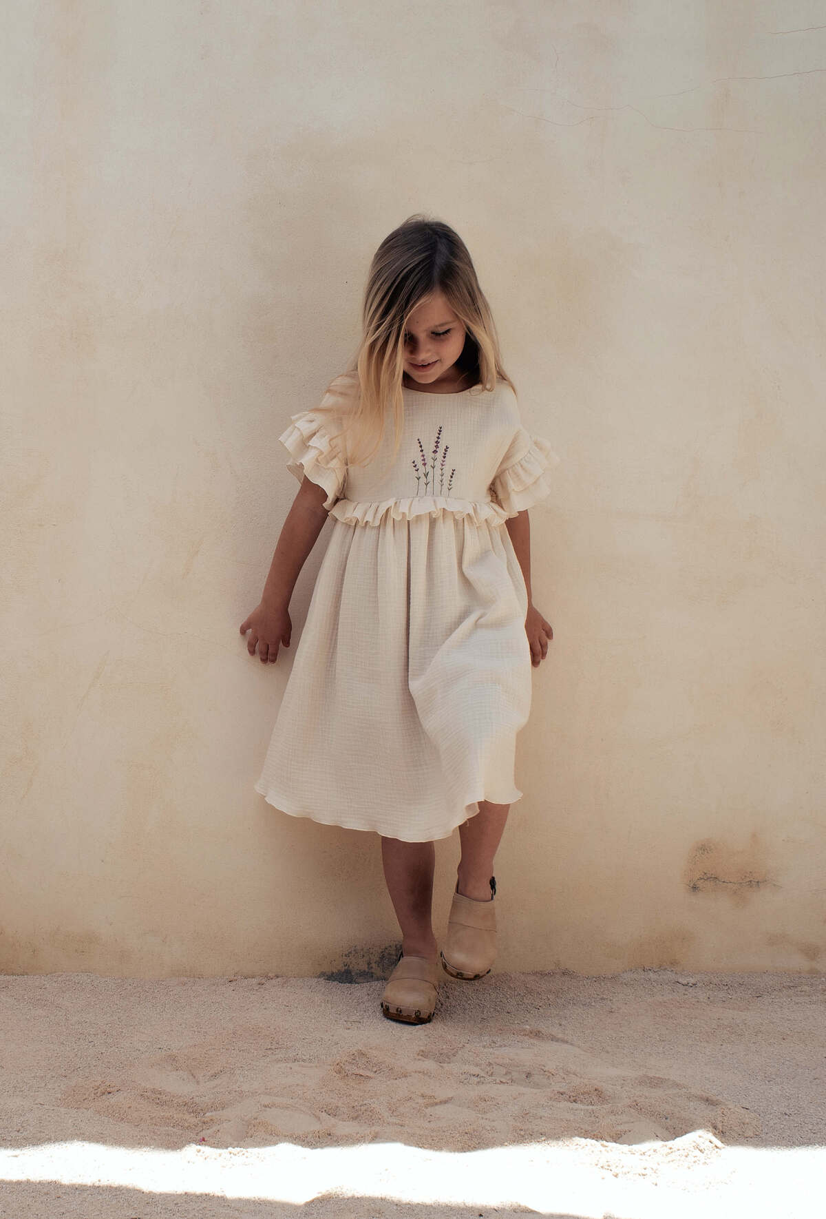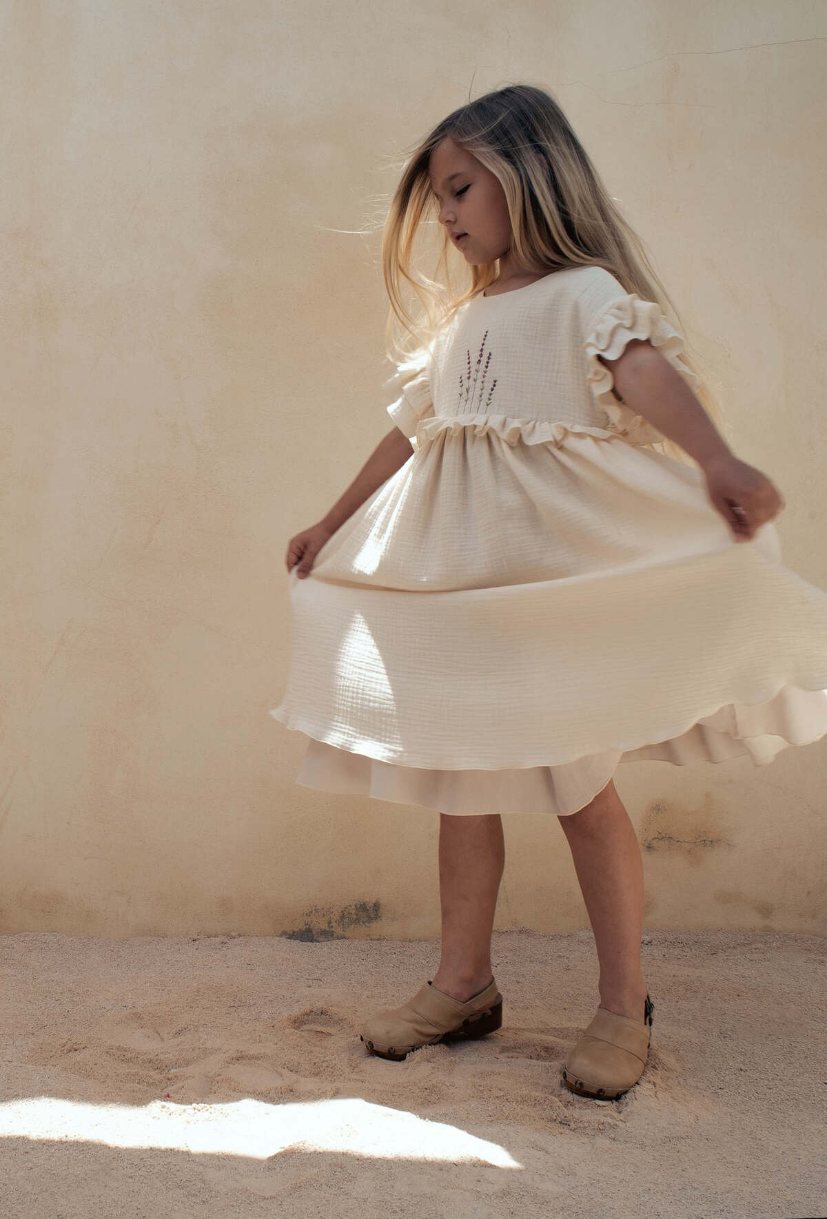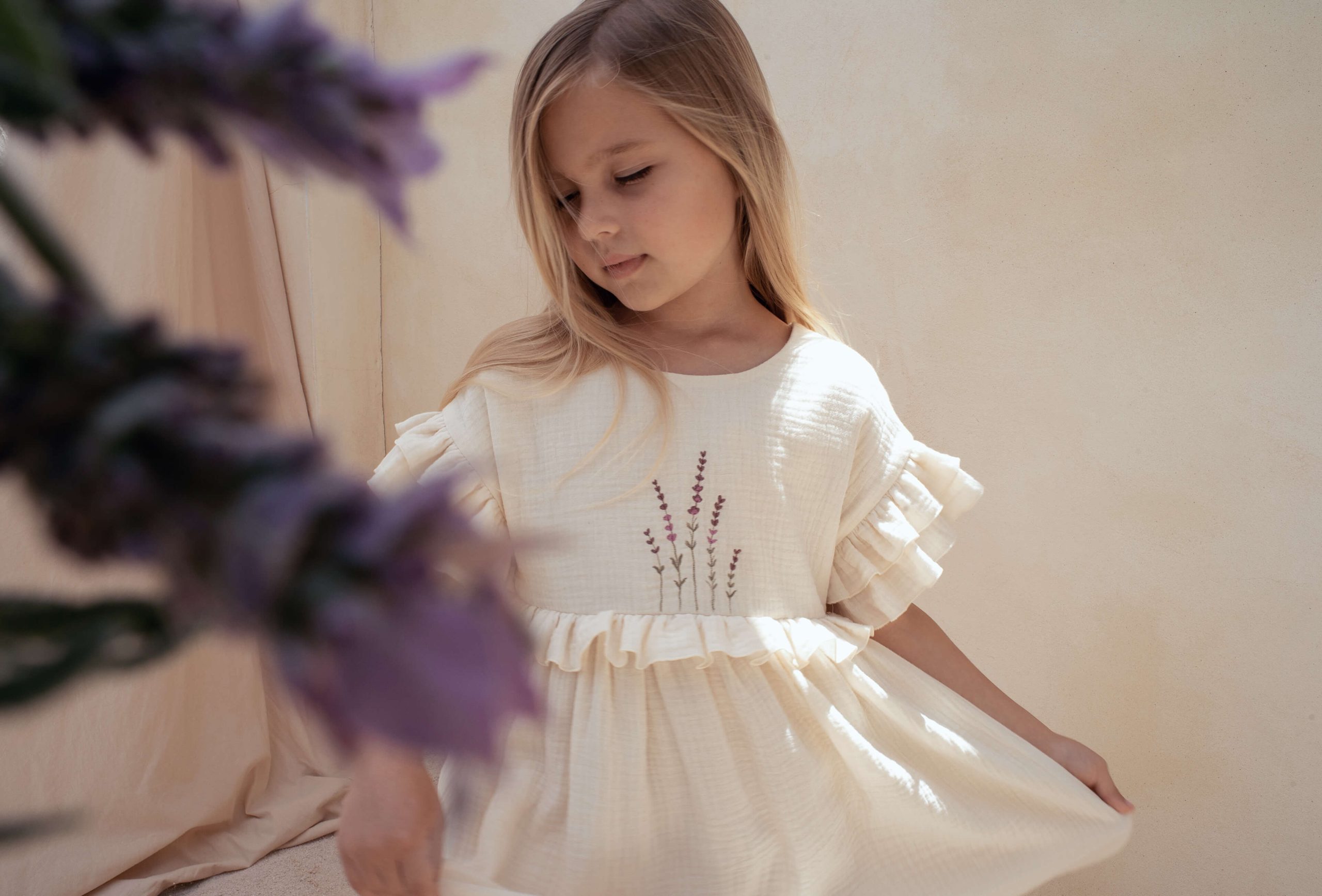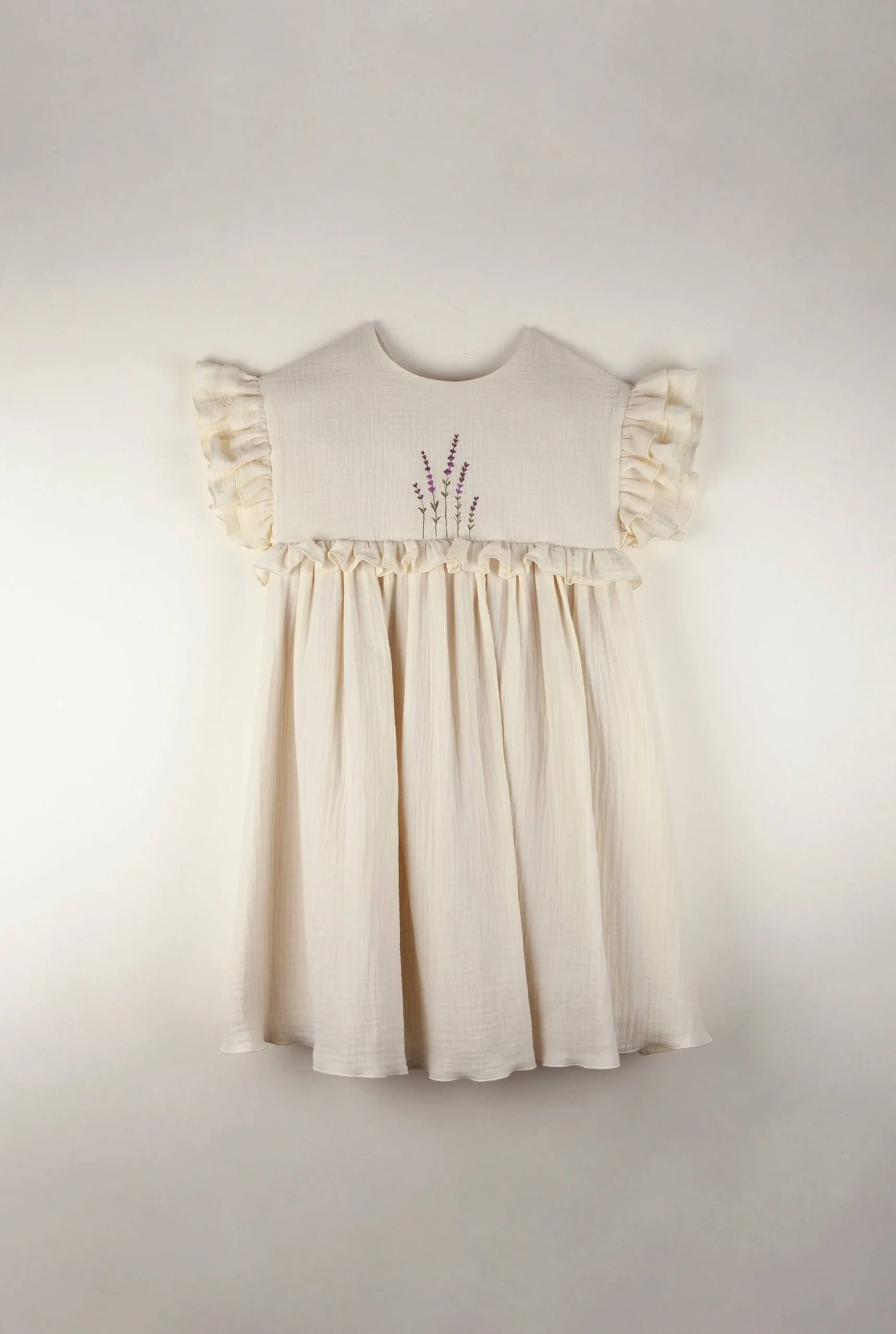 Cette robe en double gaze de coton biologique sera un plaisir à porter ! Agréable avec sa coupe ample, la robe Blanca est épurée et en même temps coquette avec sa broderie exclusive de lavande et ses volants au niveau des manches et de la taille. Joli dos croisé en V.