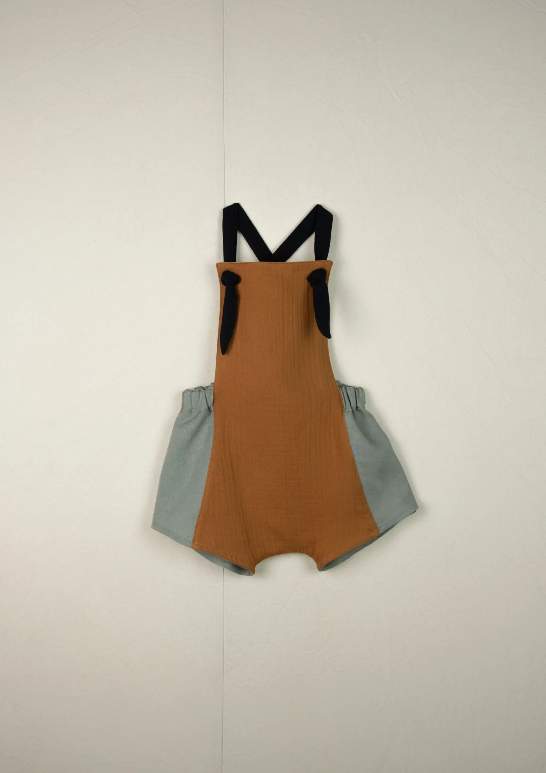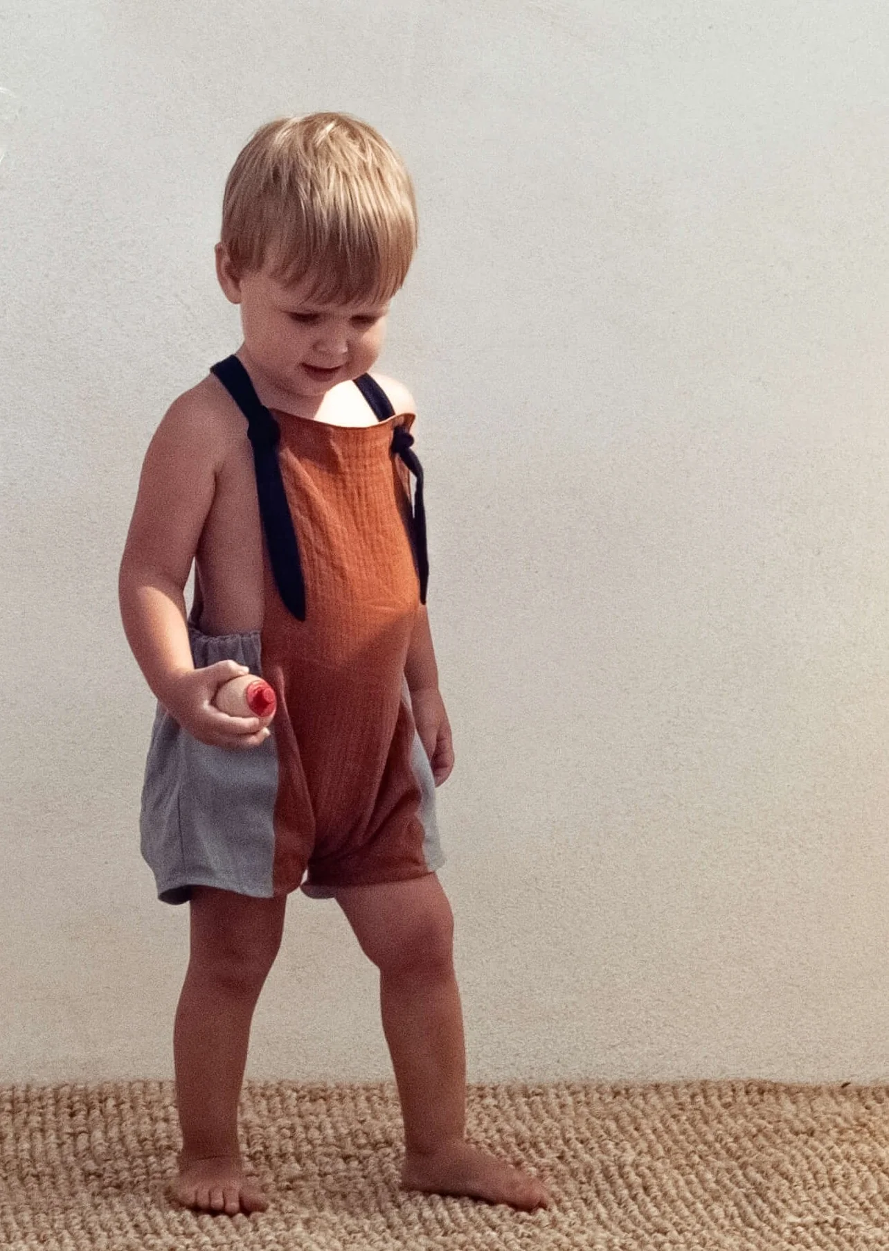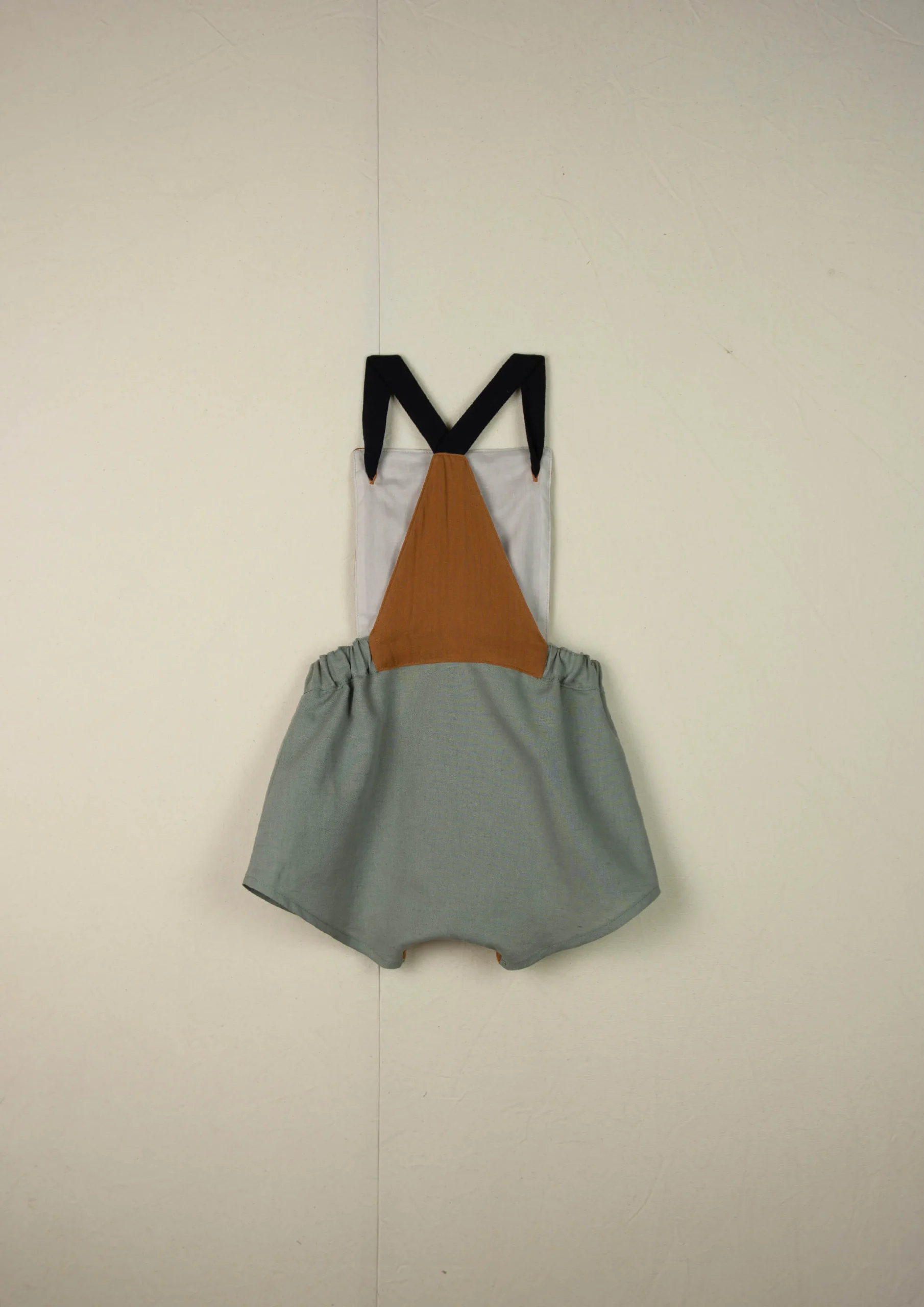 Salopette courte tricolore pour garçon avec bretelles réglables et taille élastique. Pour un look décontracté et orignal, une de nos pièces préférées de cette collection !