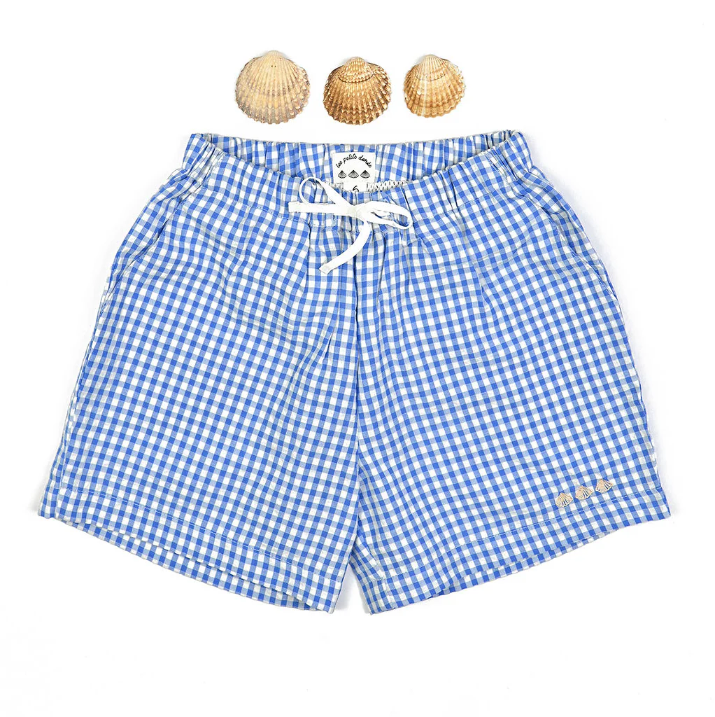 Élégant short vichy bleu qui se mariera parfaitement avec tous nos T-shirts anti-UV. Un classique aux jolies finitions avec trois petits coquillages brodés sur le côté.