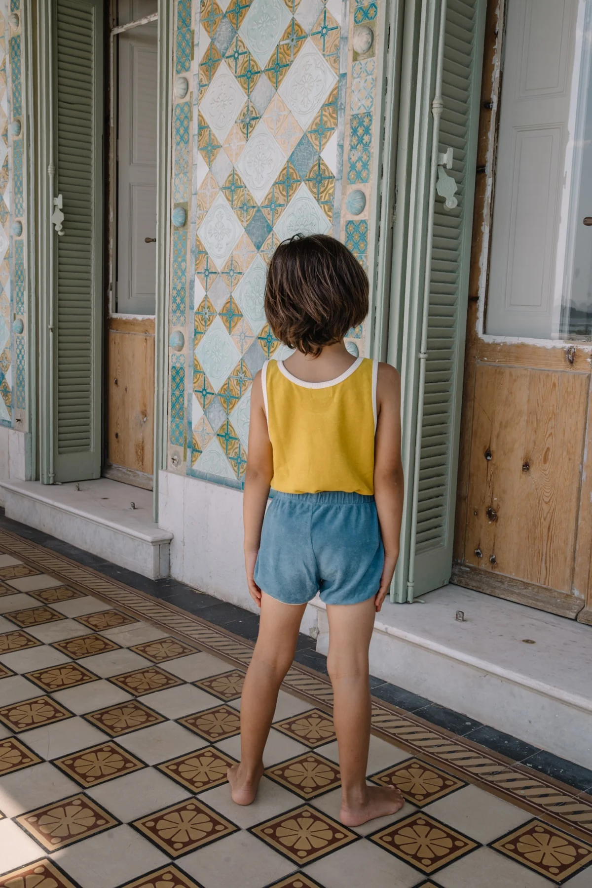 Short bleu ciel avec taille élastique, bord côte vanilla contrastant. Matière éponge toute douce et absorbante en coton bio.