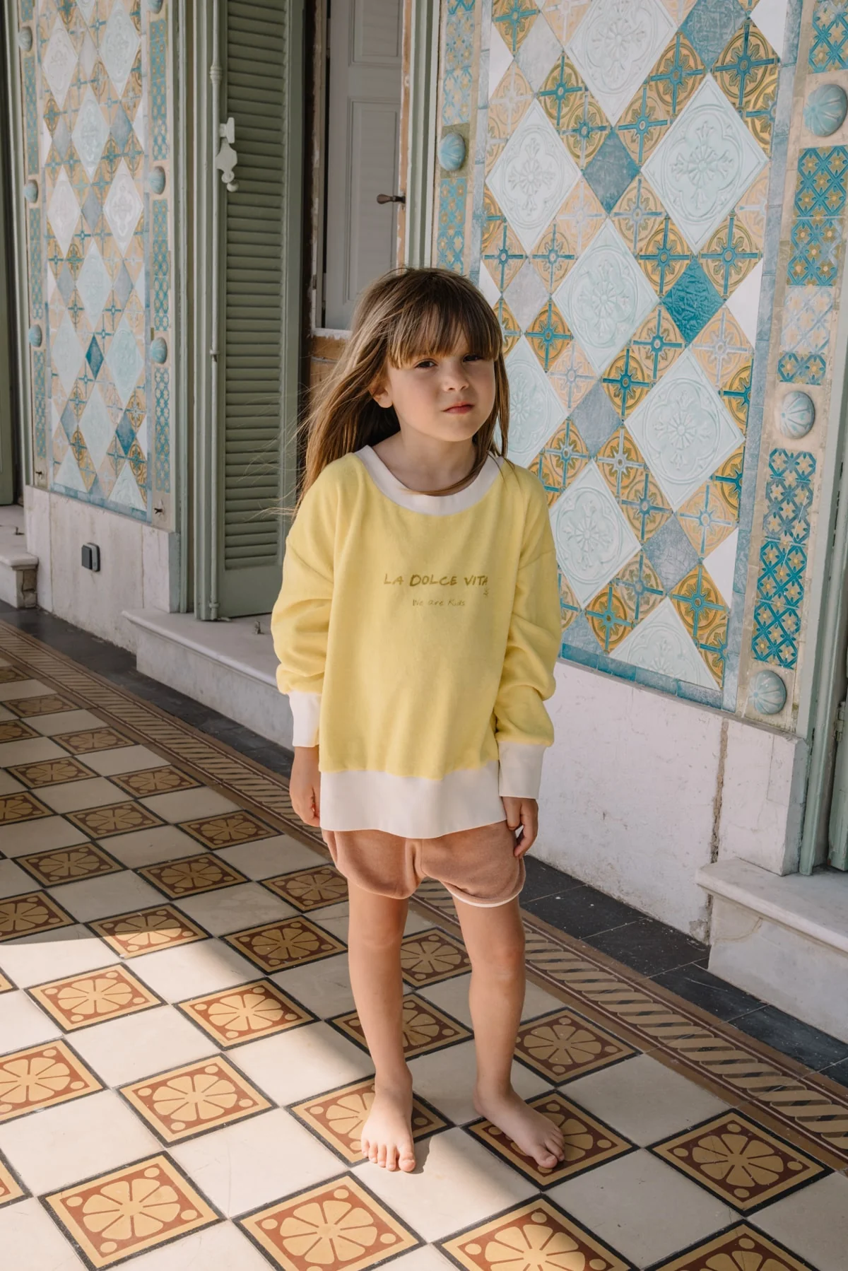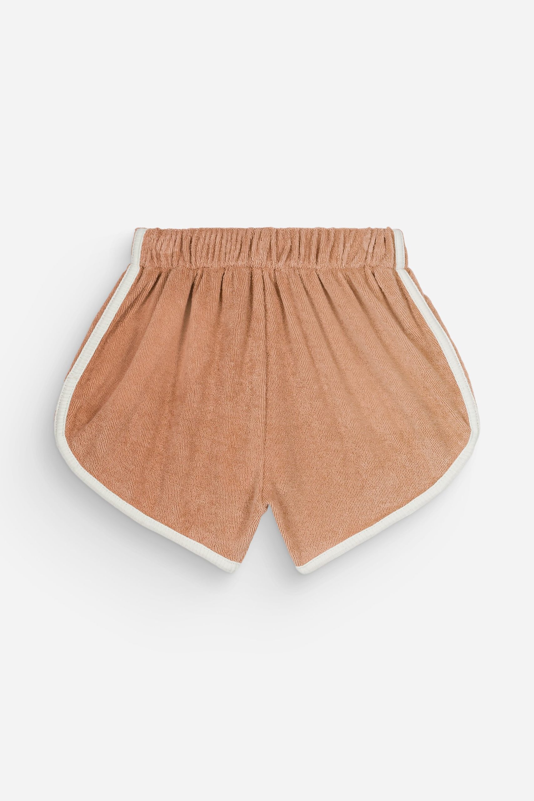 Short couleur pêche avec taille élastique, bord côte vanilla contrastant. Matière éponge toute douce et absorbante en coton bio.