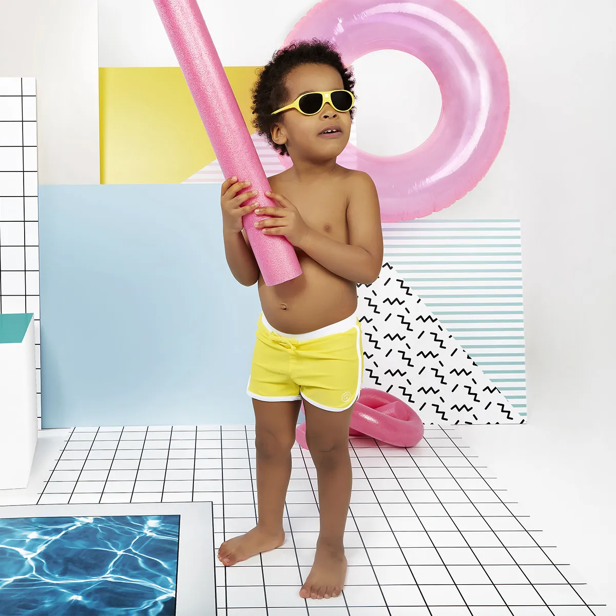 Labelisé Oeko-Tex et conçu en matériaux Anti-UV non chimiques le short Screech protège tout en douceur la peau fragile des tout-petits (sans troubler les poissons).