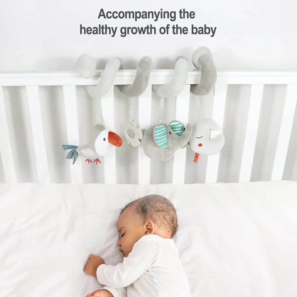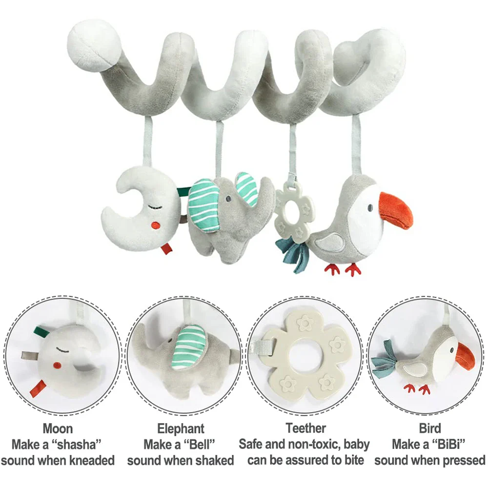 Chaque spirale inclut des personnages colorés et doux à saisir, des éléments de dentition, ainsi qu’un module musical et un pouet-pouet sonore, qui émet un petit bruit amusant lorsque bébé le presse, pour l’éveil auditif.