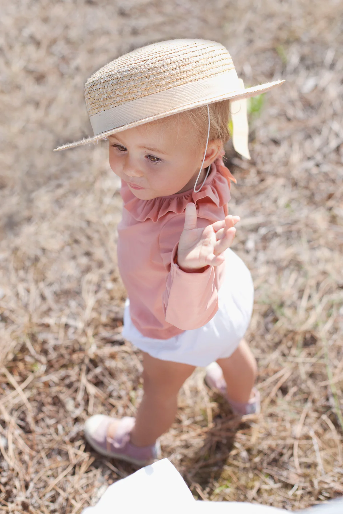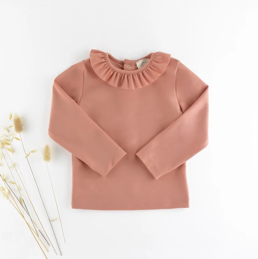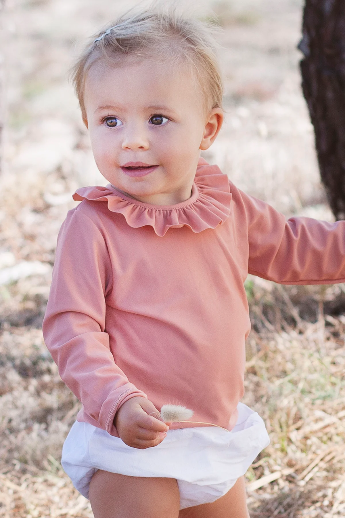 Élégant haut de maillot anti UV rose corail avec son joli col volanté. La meilleure des protections : UPF 50+ (filtre 98% des UV).