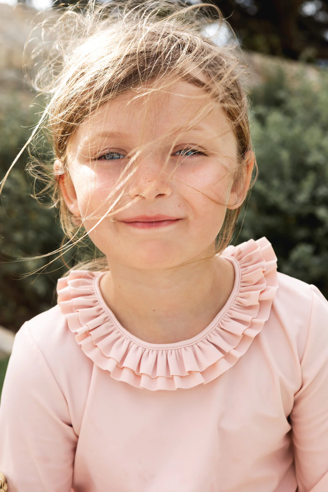 Élégant haut de maillot anti UV rose nude avec son joli col à double volant et ses poignées joliment travaillées. En plus ce T-shirt anti-UV offre la meilleure des protections : UPF 50+ (filtre 98% des UV). De quoi passer des heures au soleil en toute sérénité.