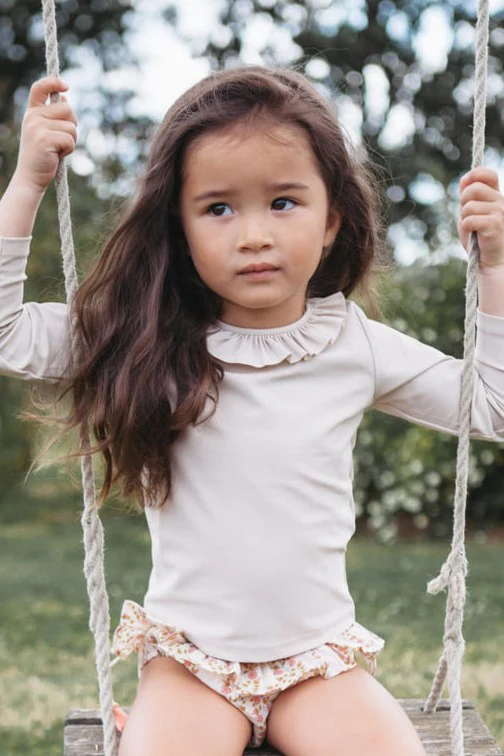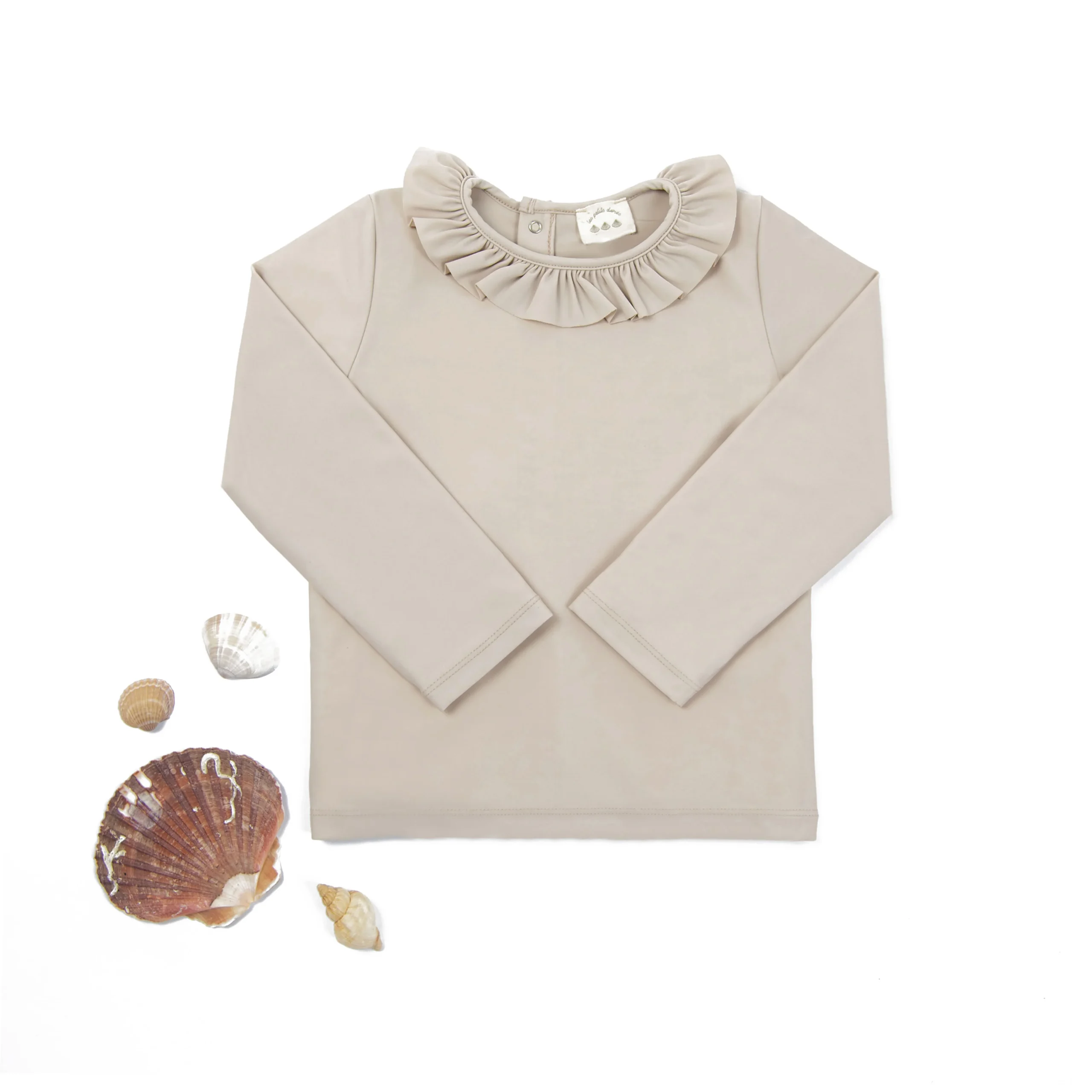 Élégant haut de maillot anti UV beige avec son joli col volanté. La meilleure des protections : UPF 50+ (filtre 98% des UV).