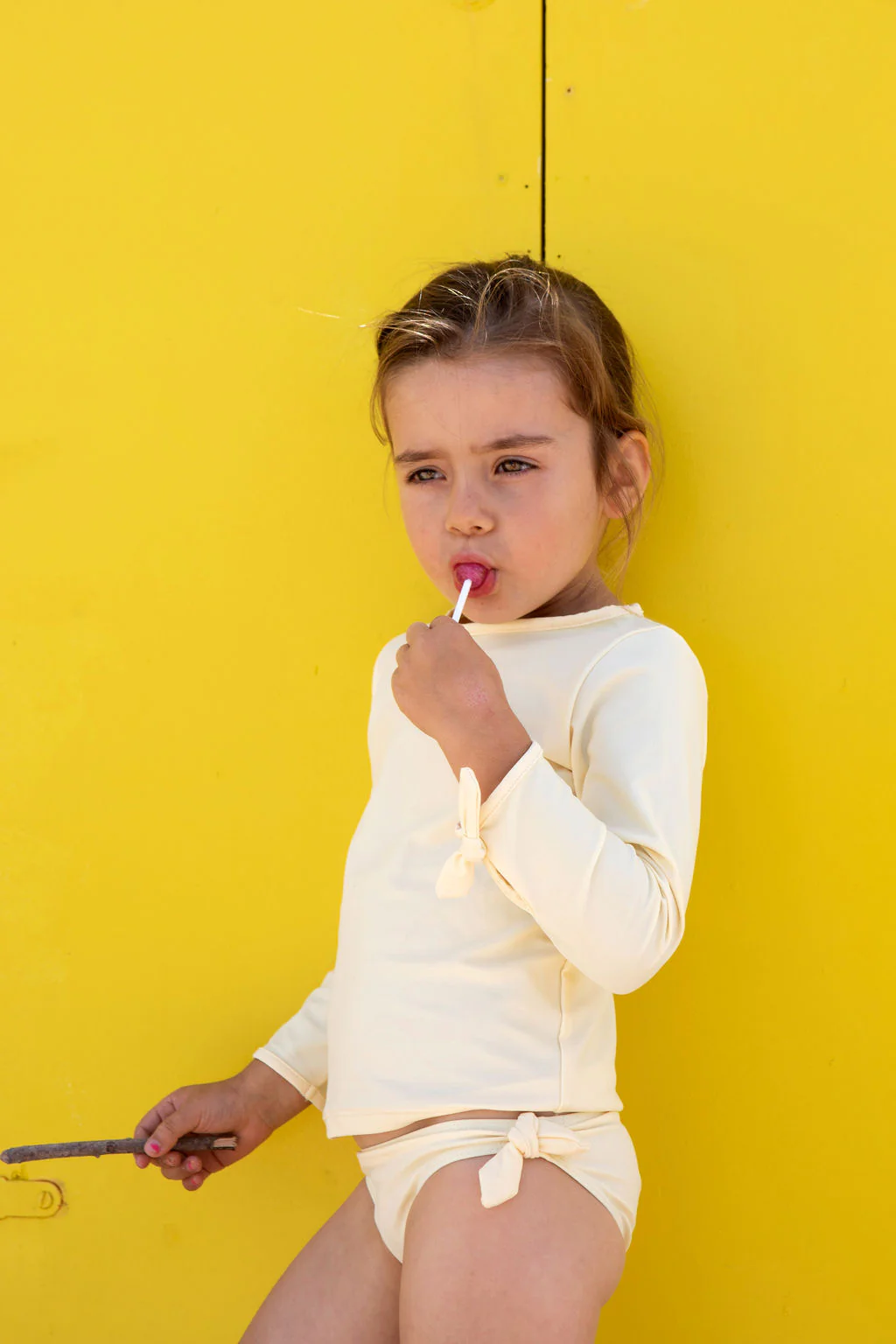 A porter avec sa culotte à nœuds assortie dans le même jaune pastel.