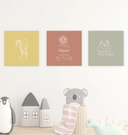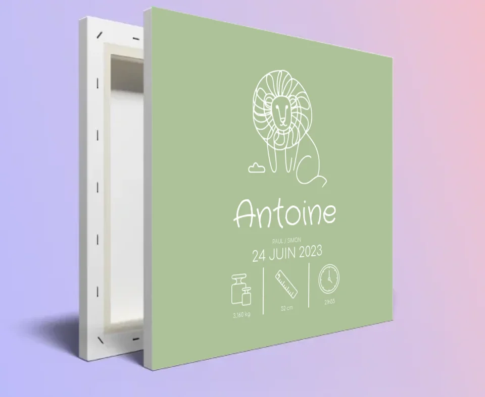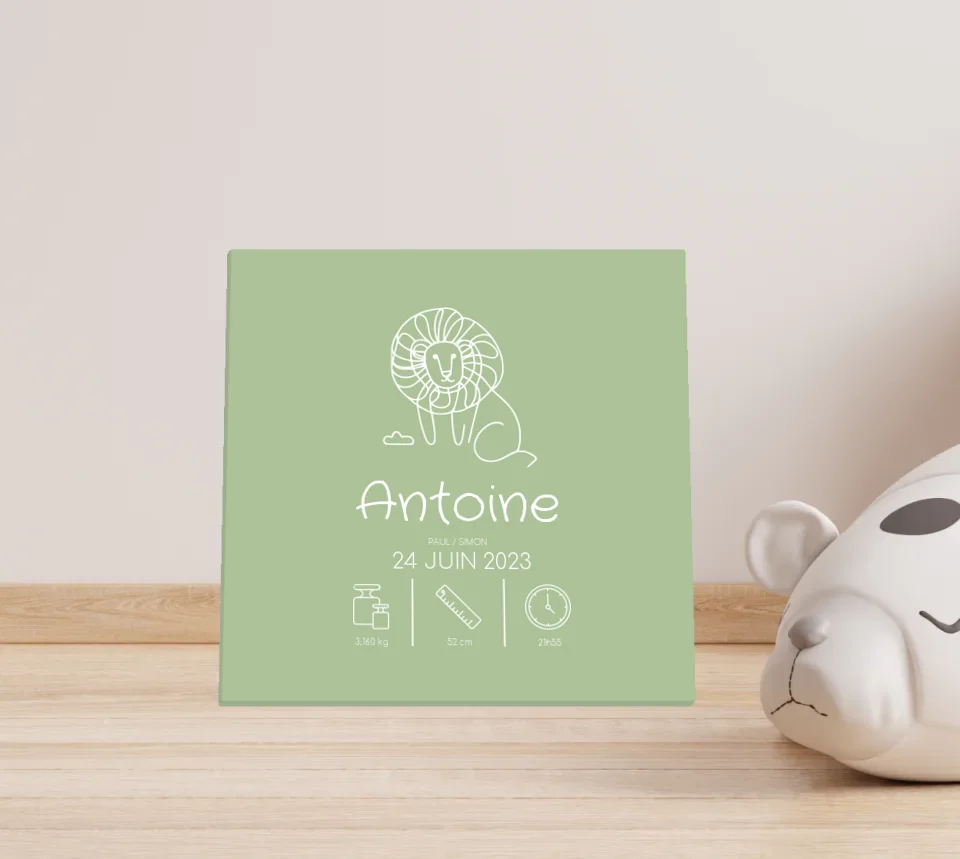Cette toile de 20×20 cm est entièrement personnalisable : choisissez la couleur, l’animal, ajoutez le prénom et les seconds prénoms de l’enfant, ainsi que ses informations de naissance comme le poids, la taille, la date et l’heure d’arrivée au monde.