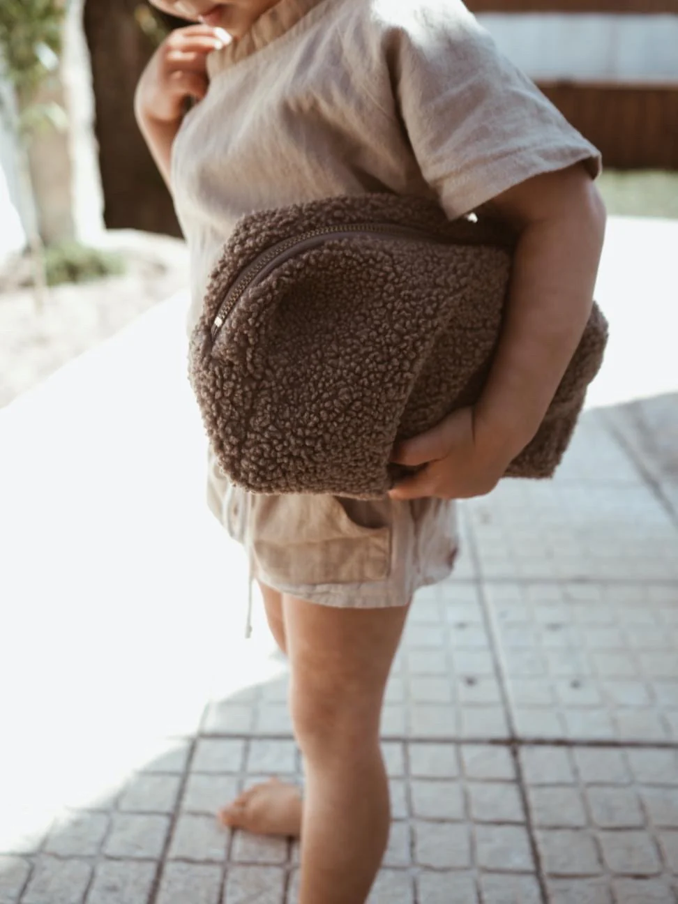 Trousse marron claire en matière moumoute douce avec zip doré. Sa contenance vous permettra d’y placer quelques couches ou lingettes ainsi que les produits de toilette de bébé.