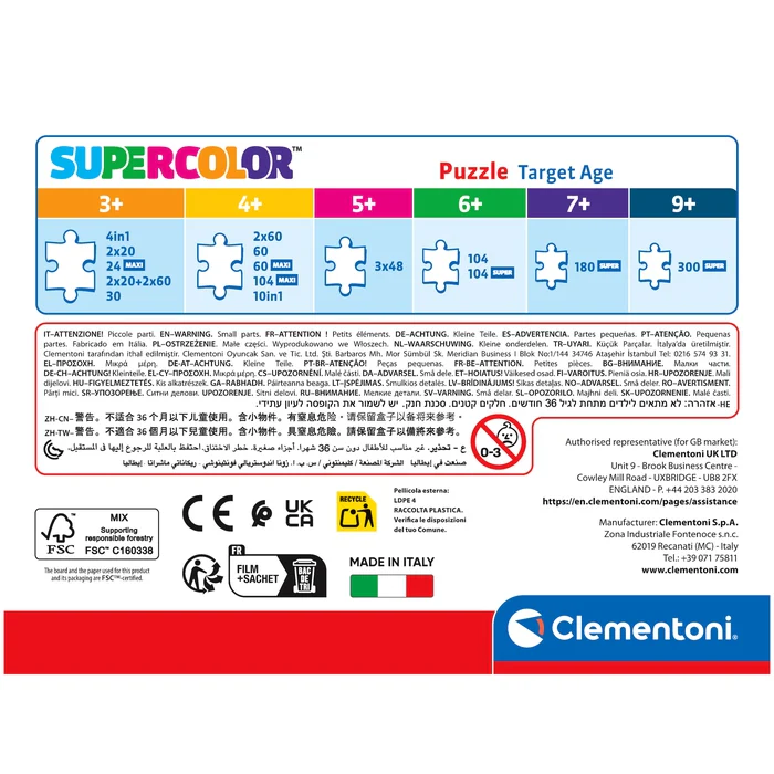 Depuis toujours sensible au problème de l’écologie, Clementoni utilise beaucoup de matériaux recyclés, évitant l’emploi de composants polluants. Made in Italy.