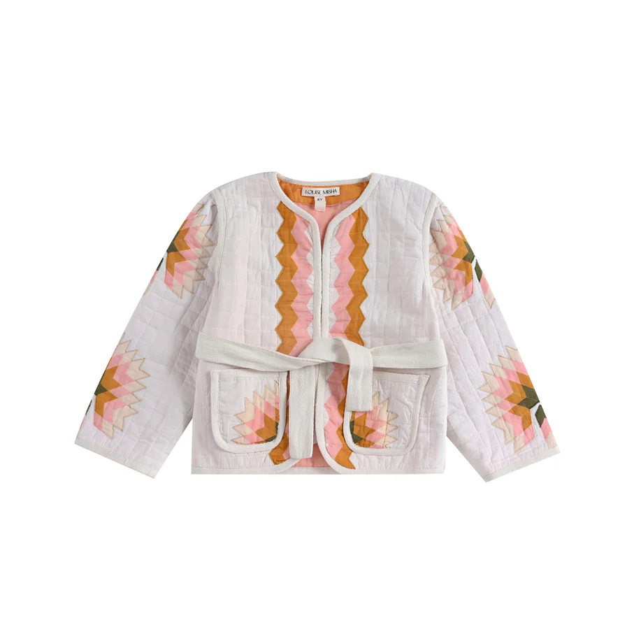 Le motif géométrique est clairement d’inspiration folklorique. Tous ses détails sont les signes d’un savoir-faire artisanal : biais contrastés herringbone sur le contour aux poches et aux emmanchures, passants et ceinture herringbone contrastés, patte de boutonnage discrète avec petits crochets. Elle dispose également de 2 poches plaquées avant et d’une doublure contrastée. Se mariera parfaitement avec un short uni comme le Short Souniya bleu clair ou le Short Clemoune Petale.